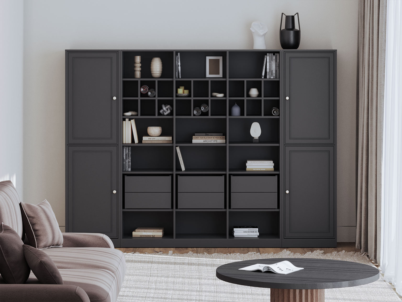 При желании стеллаж можно комплектовать дополнительными полками и ящиками из одноименной коллекции.