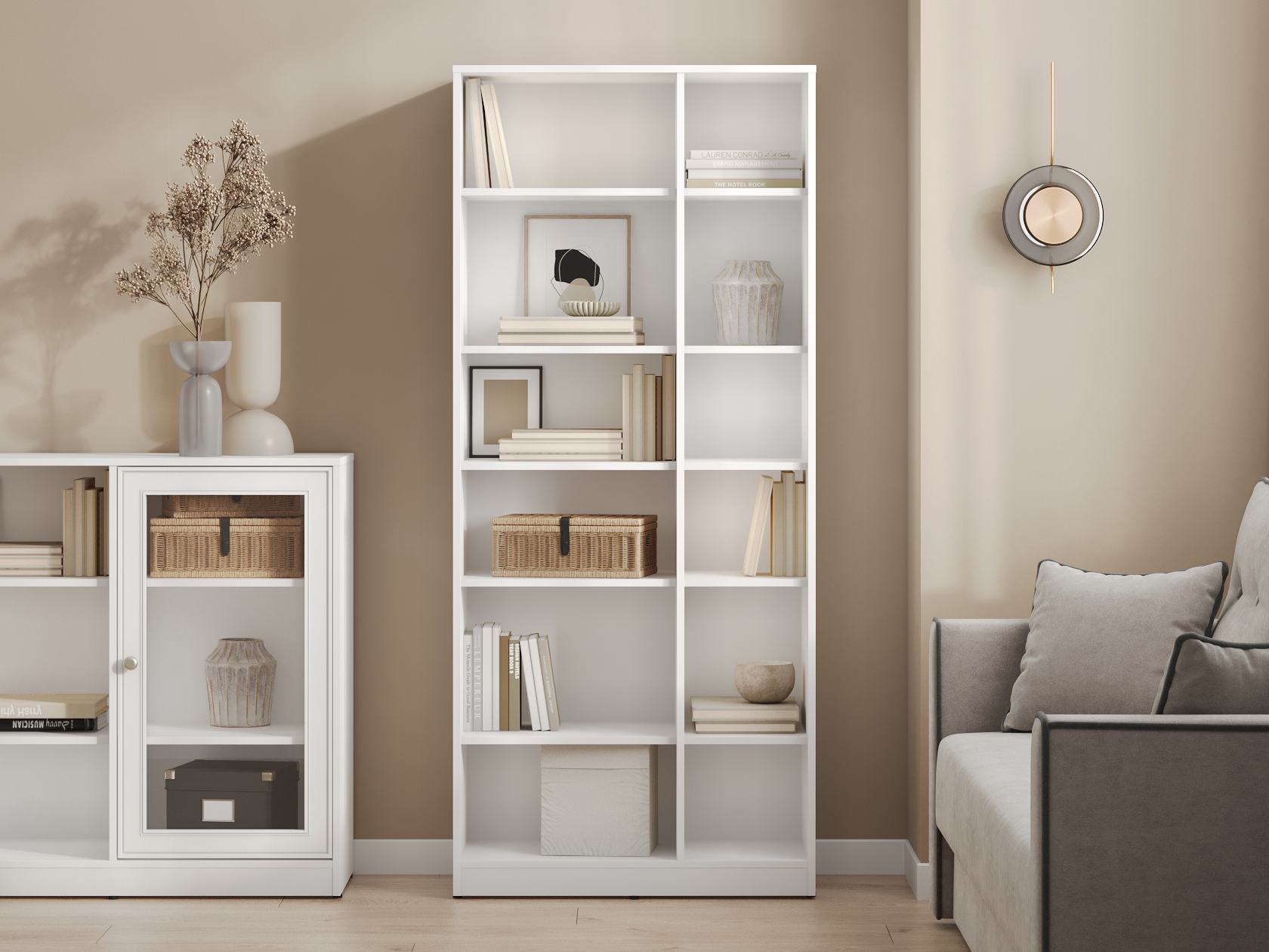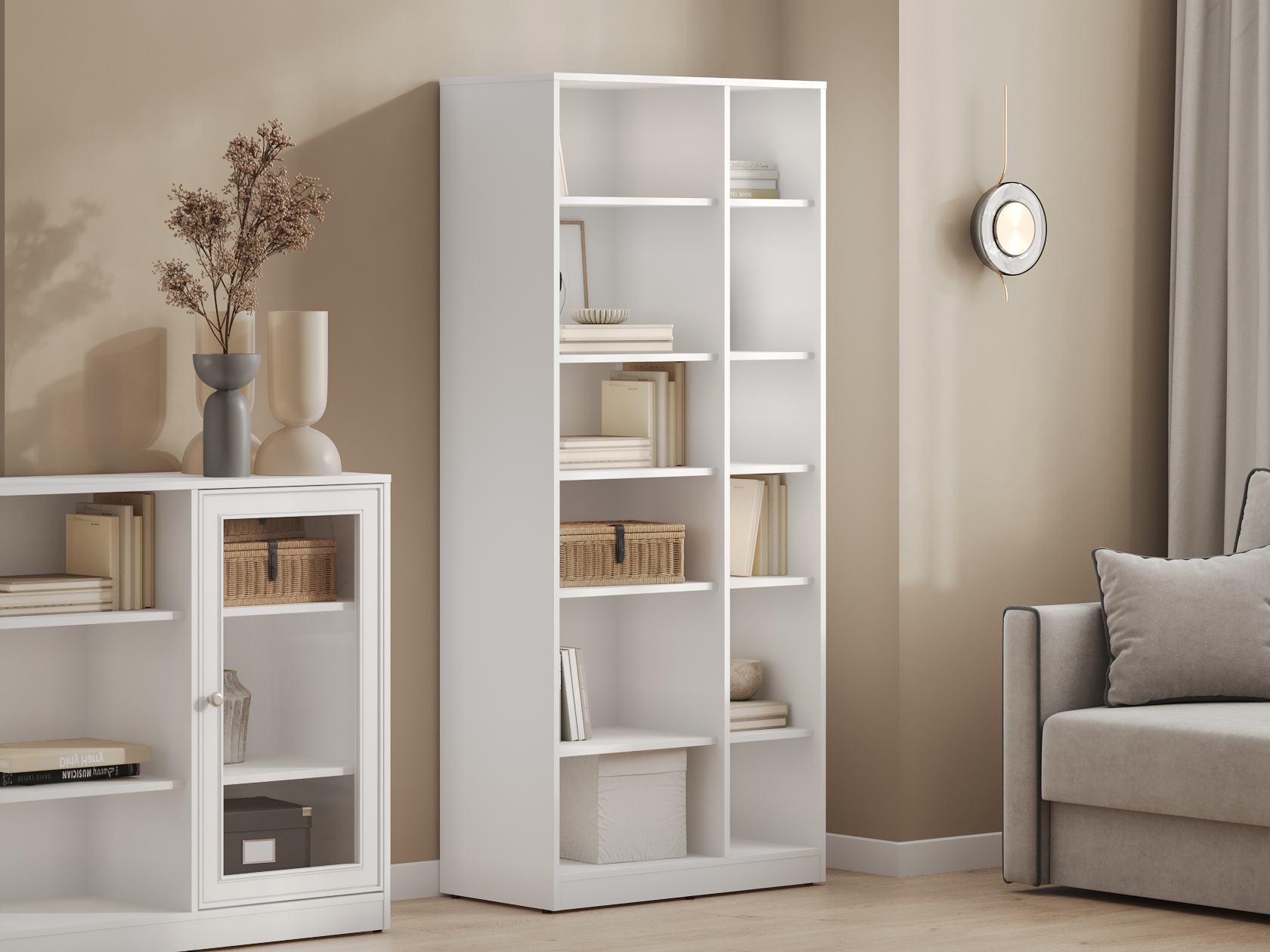 При желании стеллаж можно комплектовать дополнительными полками и ящиками из одноименной коллекции.