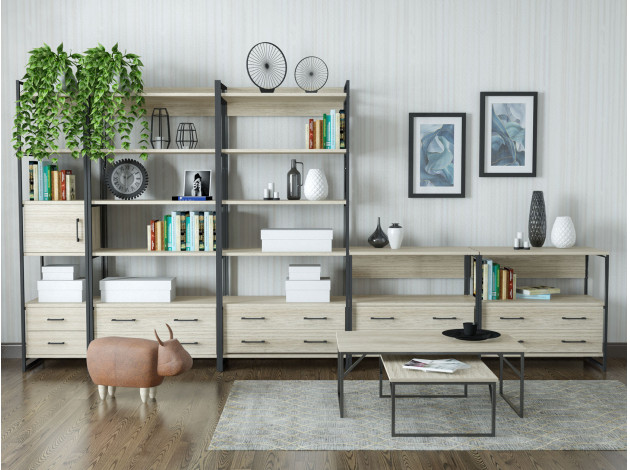 Набор стеллажей Матисс прекрасно справится с хранением всего необходимого. Благодаря разноплановым модулям можно создавать уникальные композиции. Множество открытых ниш, выдвижных ящиков и отделение за распашной дверцей разместят предметы гардероба и прочие вещи.