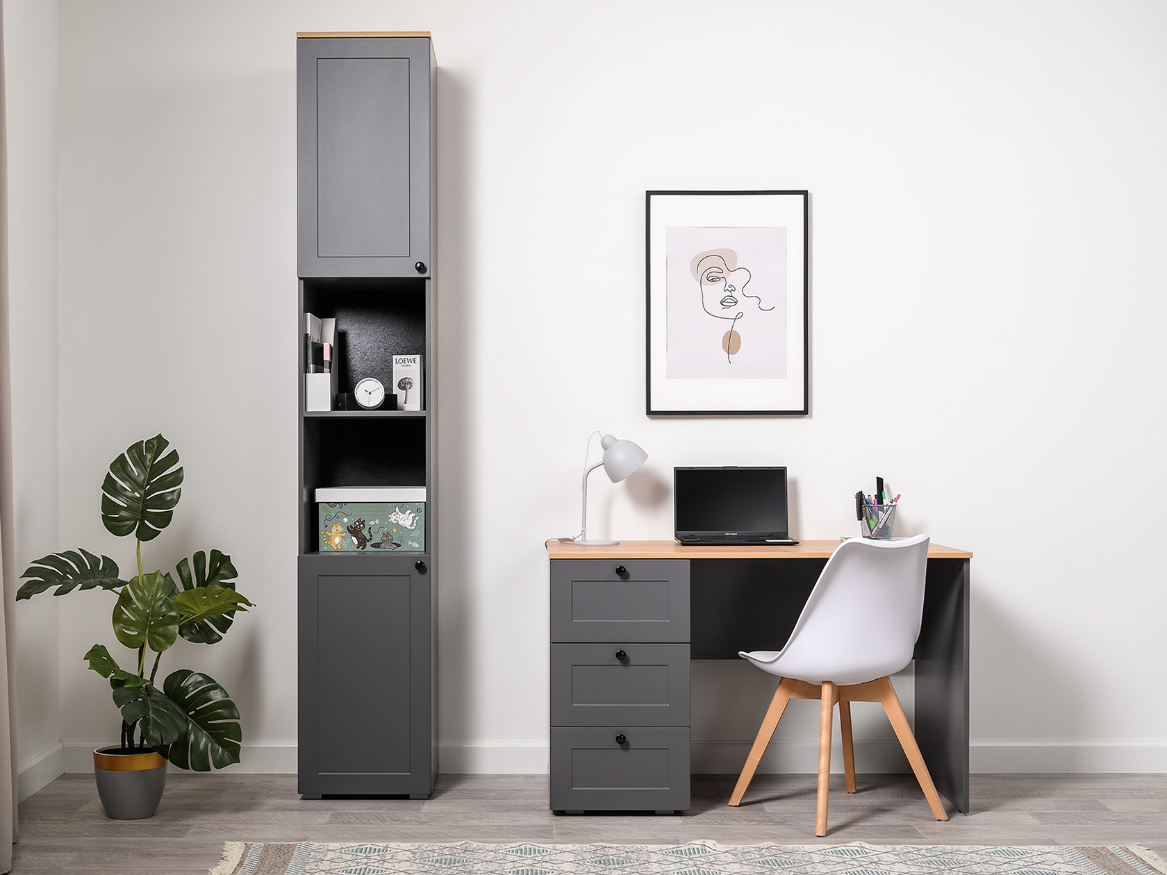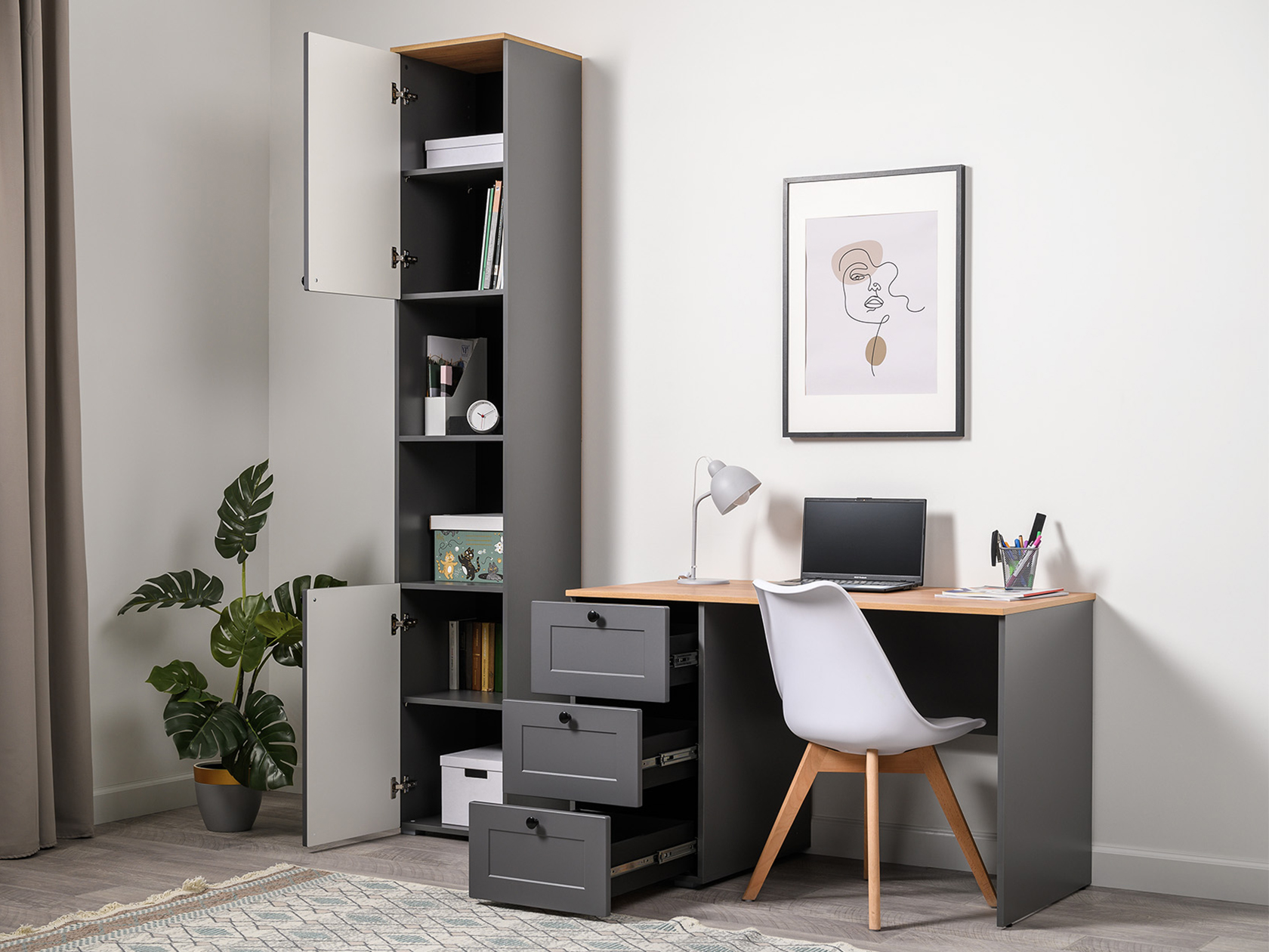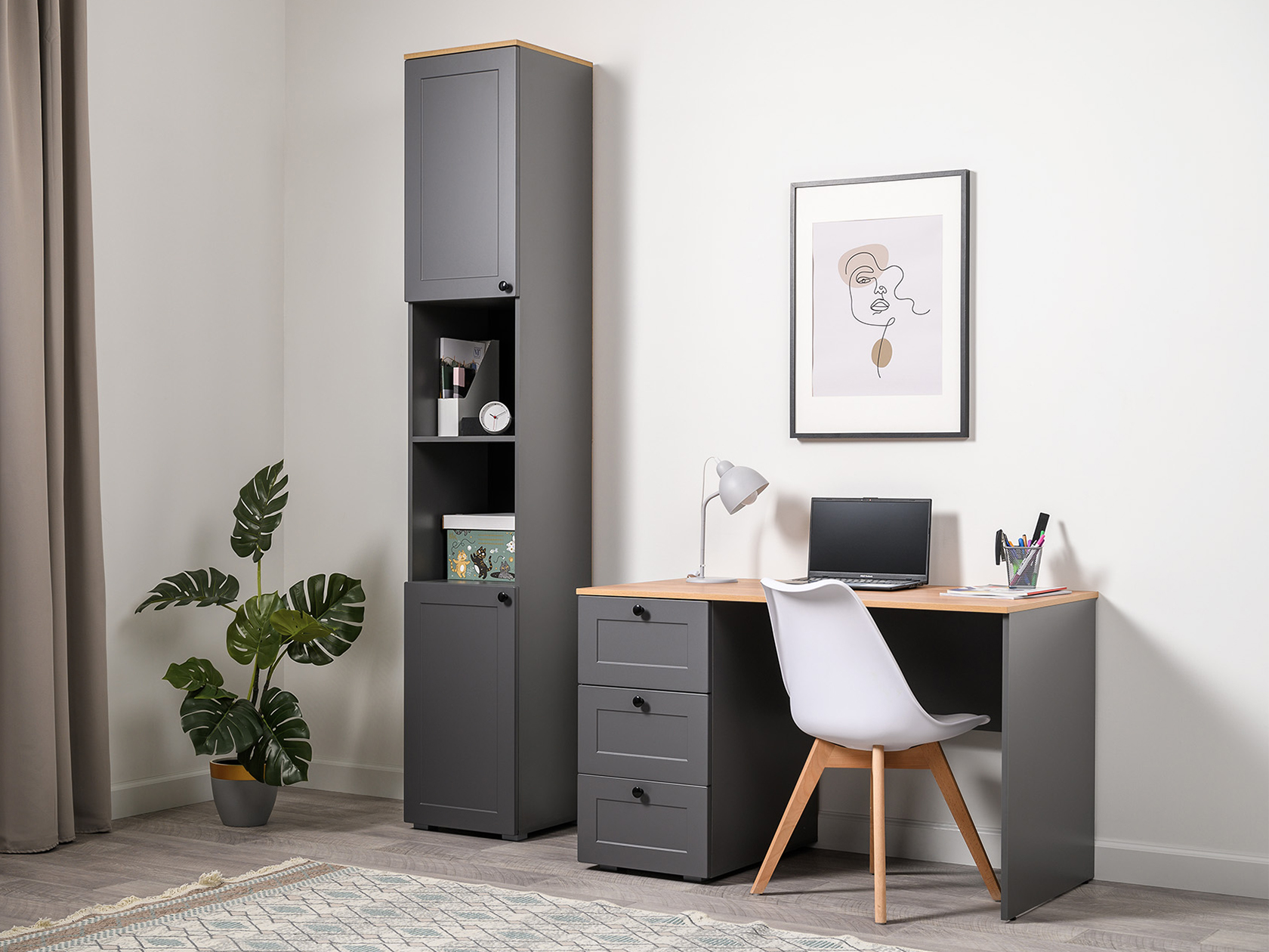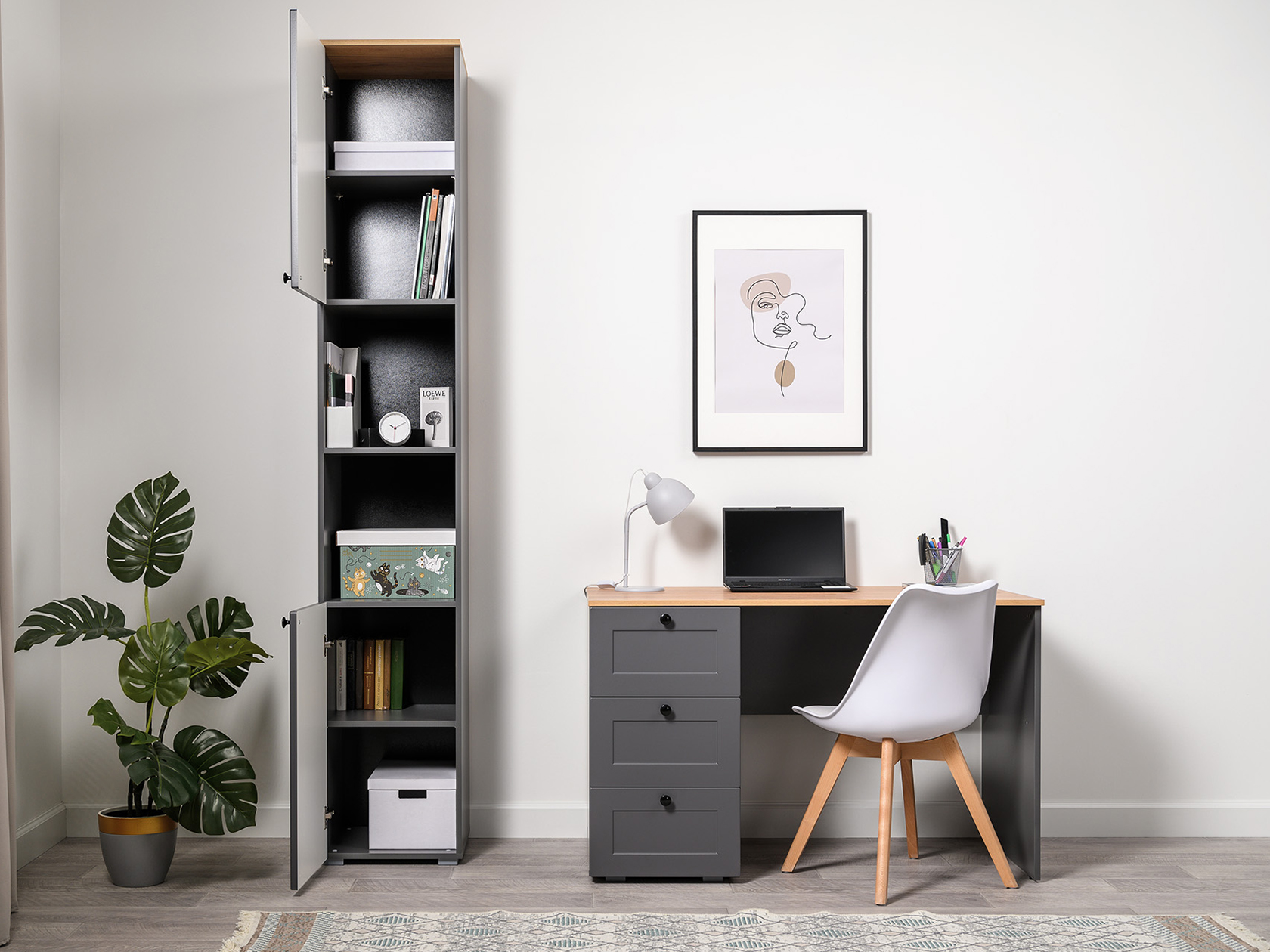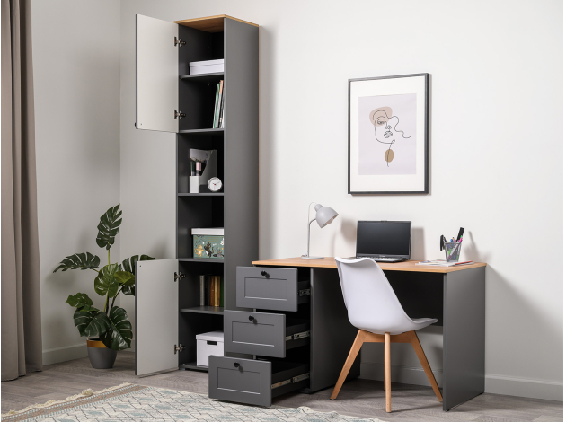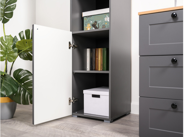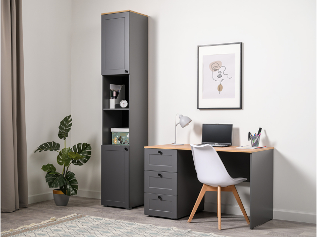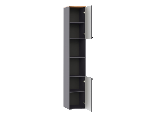 Стеллаж Остин — универсальная модель для организации рабочего пространства дома или в офисе. Высокая узкая конструкция экономит полезную площадь комнаты. На полках найдется место для различных вещей: от предметов обихода до книг и документов. Матовые фасады украшены тонкими декоративными рамками. Такой дизайн долго не потеряет актуальность.