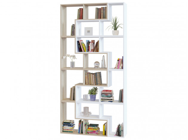 Вместительный стеллаж ПК-9-8, выполненный в необычной геометрии — стильный способ разнообразить интерьер. Модель будет полезным предметом меблировки в гостиной, спальне или рабочей зоне. Большое количество полочек разного размера позволяют хранить самые разные вещи и предметы в быстром доступе.