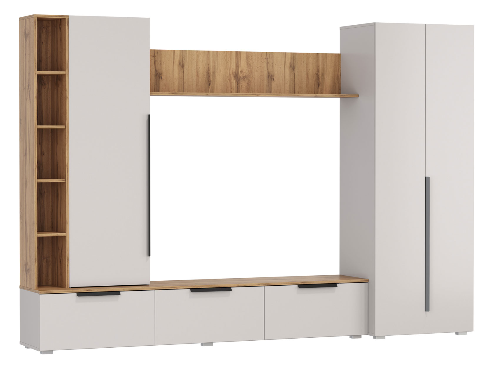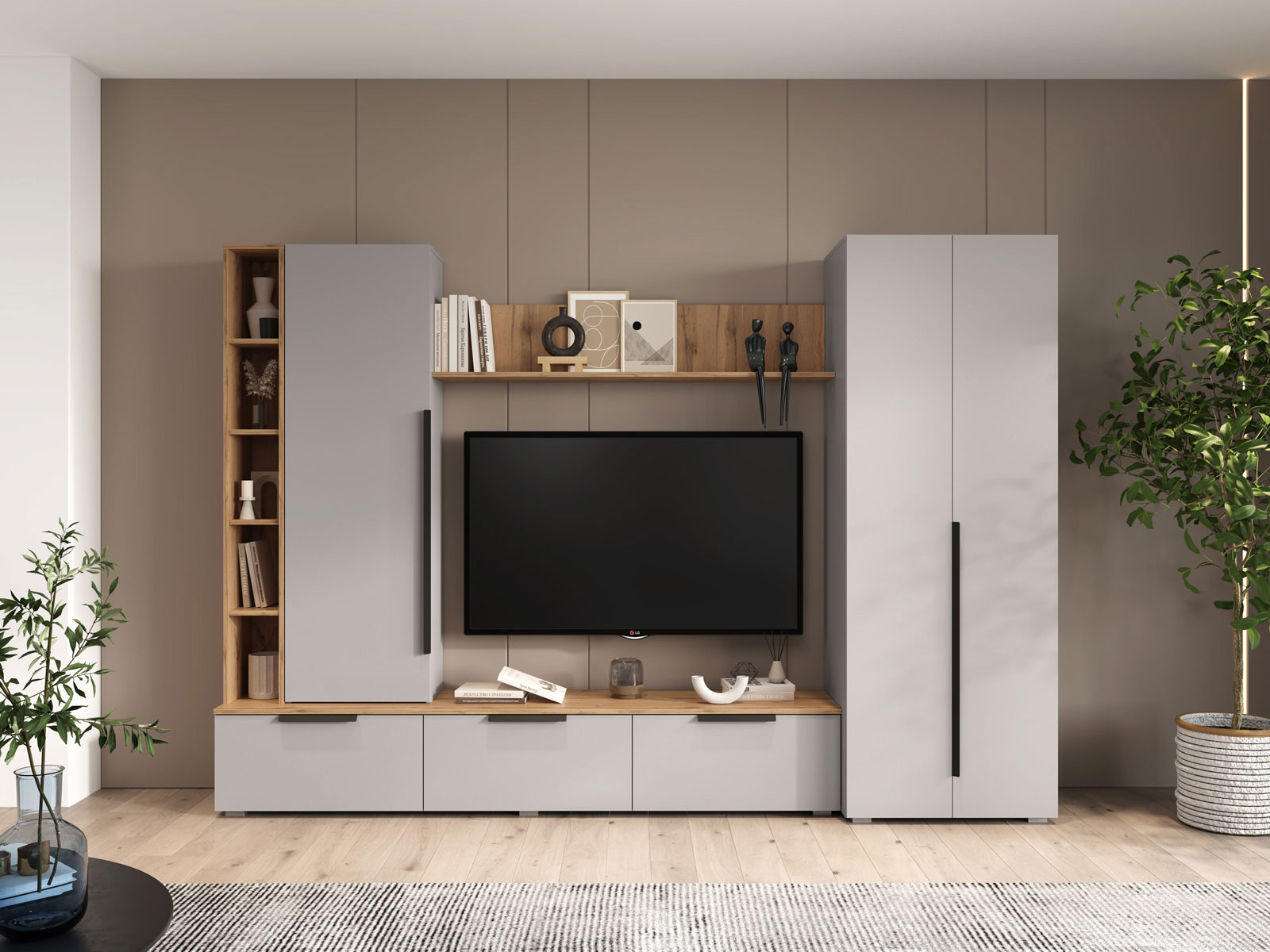 Гостиная Аккорд Макси поможет обустроить интерьер главной комнаты с акцентом на практичность. В конструкции всё продумано для рационального хранения одежды, декора, книг и прочих бытовых принадлежностей. Центральная ниша обеспечит место под телевизор большой диагонали и другие элементы мультимедийной системы. Сочетание глухих фасадов и открытых ниш создает визуально приятный и уютный интерьер. Узкие лаконичные ручки не перетягивают на себя внимание и поддерживают тренд на минимализм.