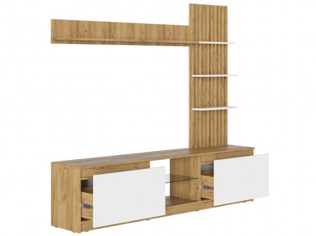 Гостиная Бостон поможет меблировать небольшую общую комнату в элегантном современном стиле. Функциональная модель позволит разместить широкоформатный телевизор, расположить на видном месте предметы декора и хранить сложенную одежду и личные вещи. Открытая полка из тонированного стекла придаст находящимся на ней предметам эффект парения. Ящики выдвигаются на всю глубину и оснащены дополнительном ребром жесткости, что значительно увеличивает срок эксплуатации.