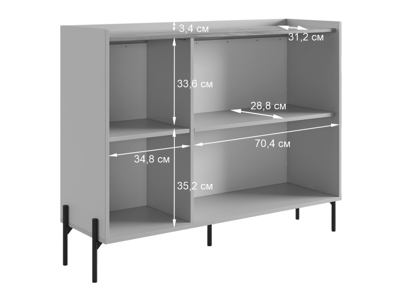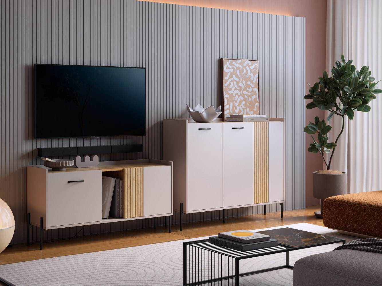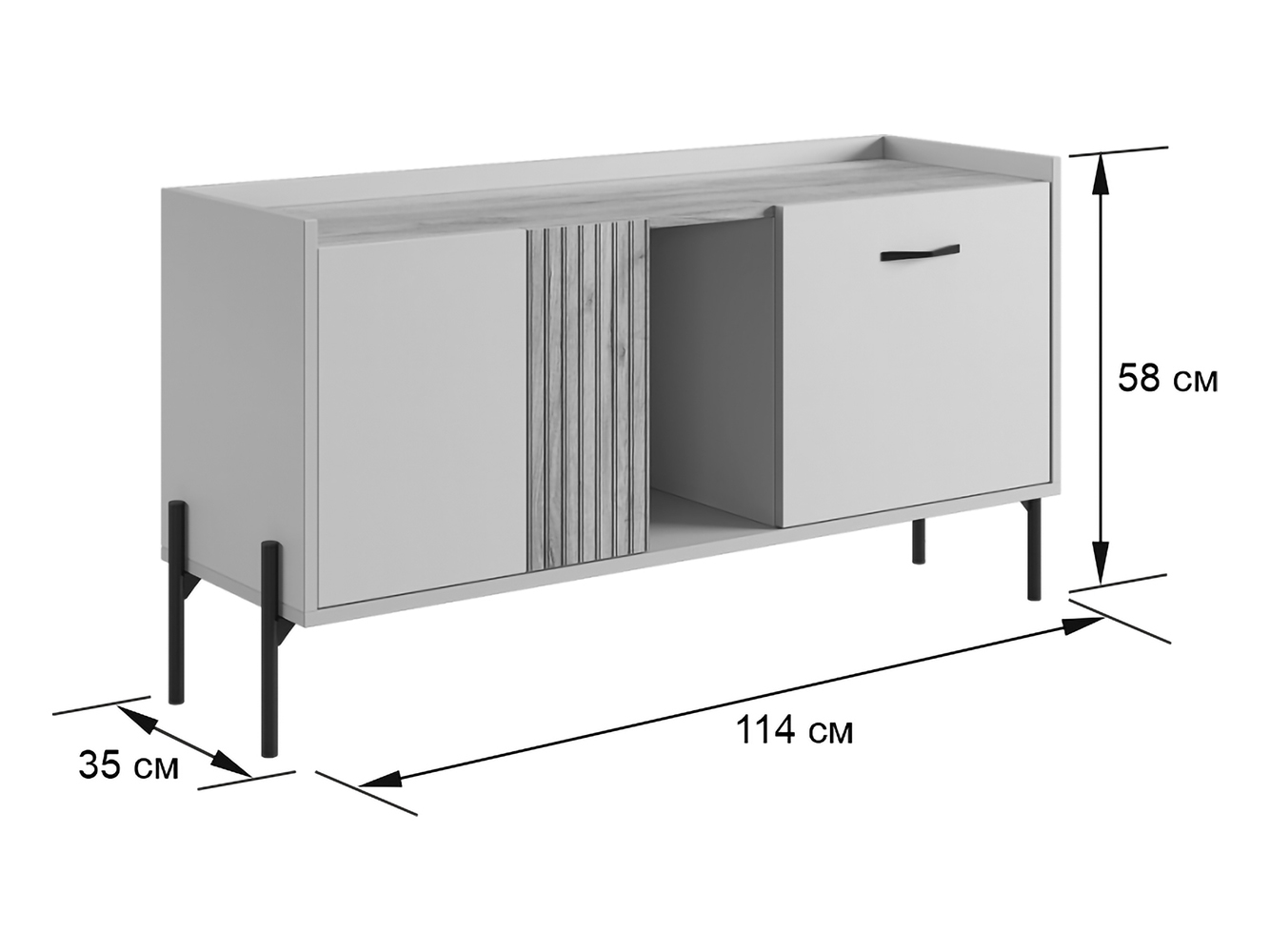 Гостиная Доминика с комодом поможет меблировать общую комнату в современном стиле. Функциональный набор мебели позволит разместить широкоформатный телевизор, расположить на видном месте предметы декора, а также хранить одежду и личные вещи. Высокие ножки создают визуально легкий облик и упрощают уборку.