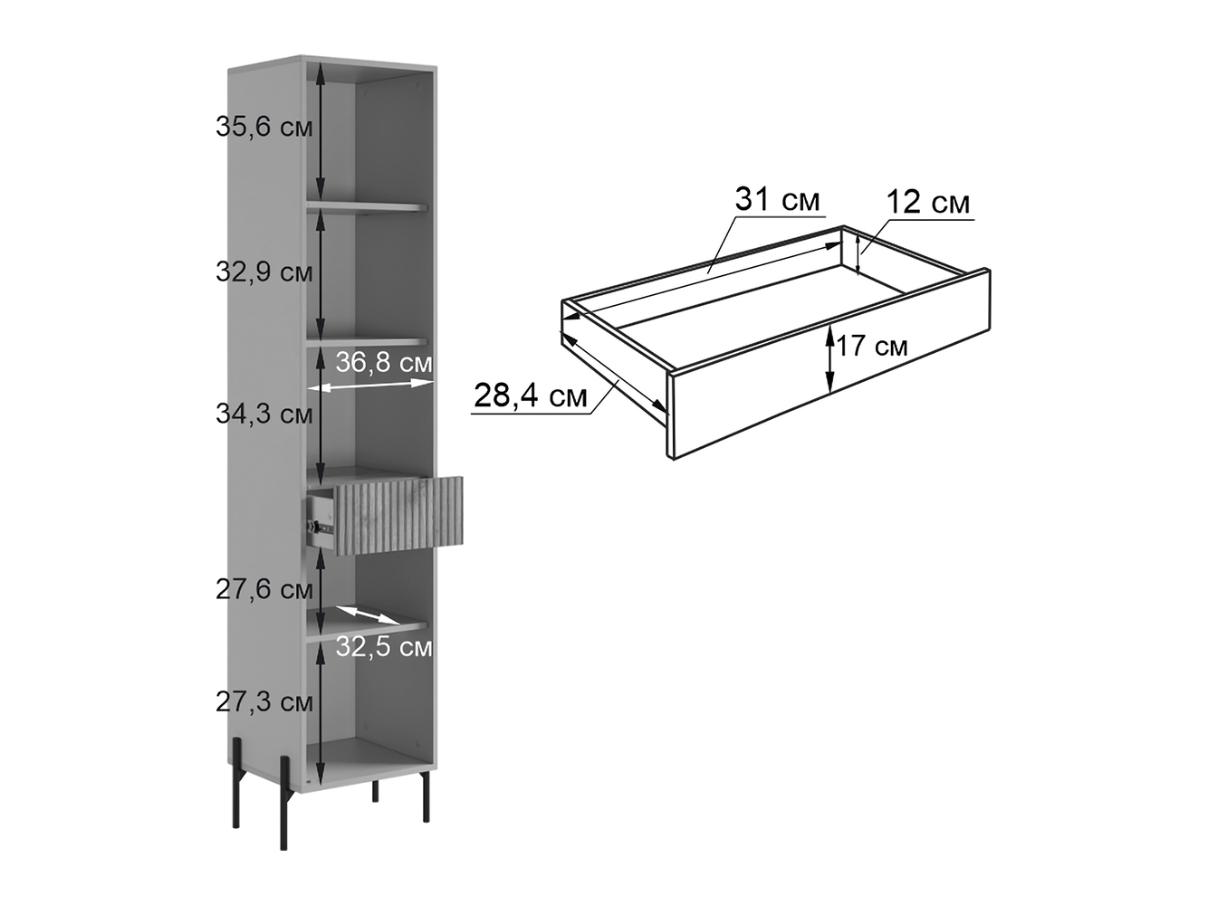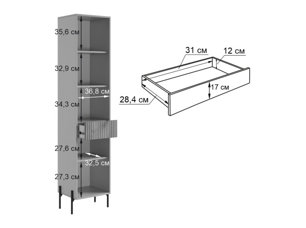 - Стеллаж: 195 х 44 х 35 см.