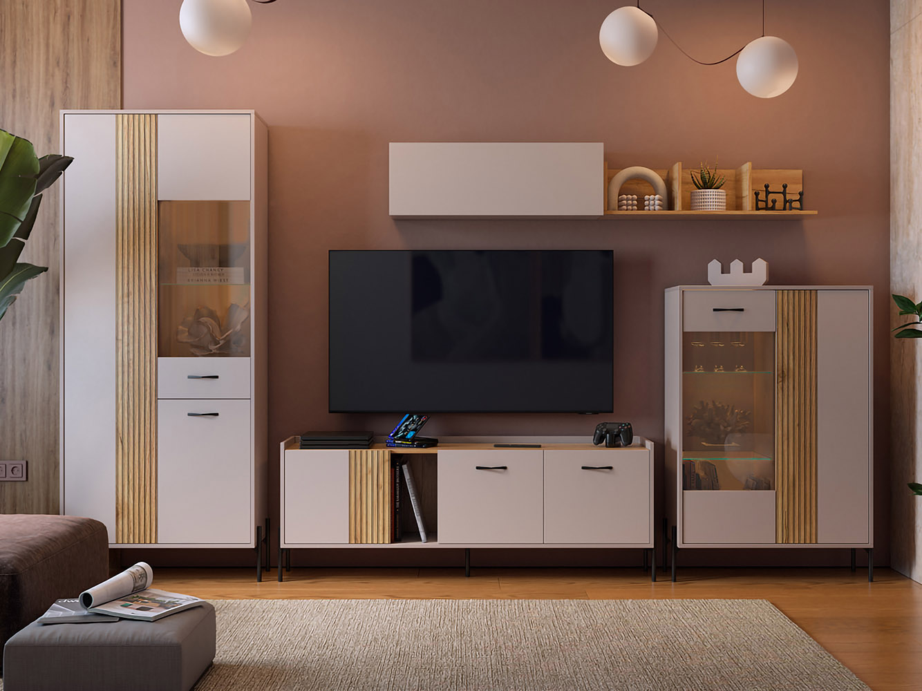 Гостиная Доминика с витринами обустроит комнату, в которой важен порядок и уют. Прозрачные витрины организуют удобное хранение, при этом позволяют продемонстрировать красивую посуду, коллекцию книг и памятных сувениров. За глухими дверцами можно спрятать разные предметы обихода, а на открытых полках — разместить декор. Пользоваться мебелью очень комфортно: ящики предоставляют полный обзор содержимого, а дверцы закрываются плавно и бесшумно.