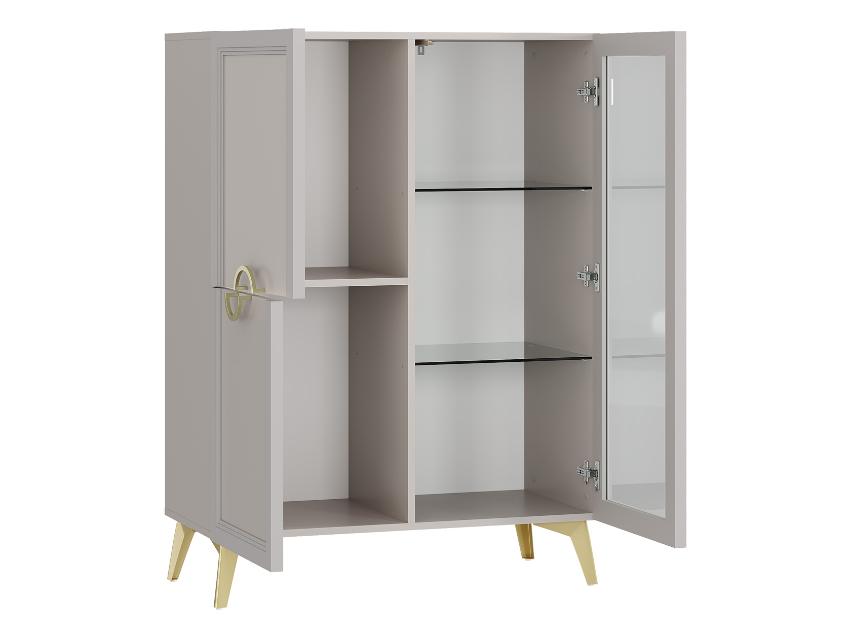 Гостиная Эстетика поможет обустроить уголок для семейного просмотра фильмов и рационального хранения вещей. Тумба с изящными золотистыми ножками станет основой под телевизор и другую мультимедийную технику. Функциональные шкафы с витриной и закрытыми секциями идеально подходят для хранения книг, посуды и декора. Матовые фасады с элегантными рамками и стильными ручками придают мебели утонченный вид.