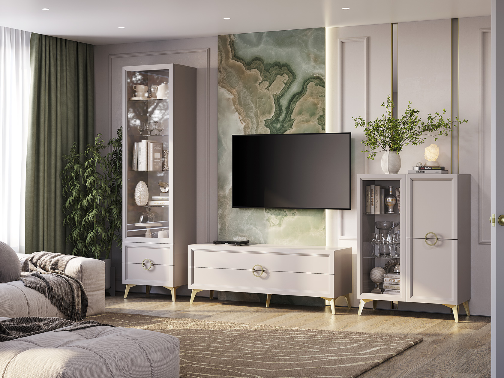 Гостиная Эстетика Оптима объединила функциональность и утонченный стиль. ТВ-тумба с ящиками создает основу для мультимедийной техники, обеспечивая место для хранения сопутствующих аксессуаров и личных вещей. Витрины с прозрачными дверцами позволяют продемонстрировать изысканную посуду или коллекцию сувениров. Разноплановые секции дополняют практичность набора, а золотистые ножки в цвет фурнитуры делают мебель особенно привлекательной.