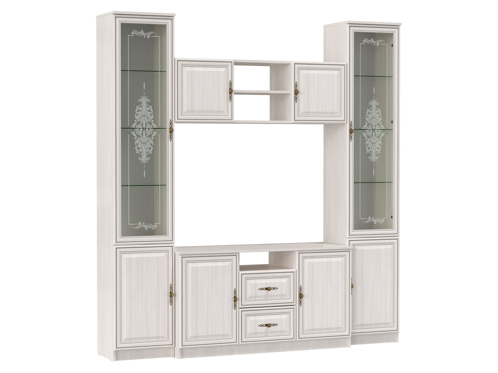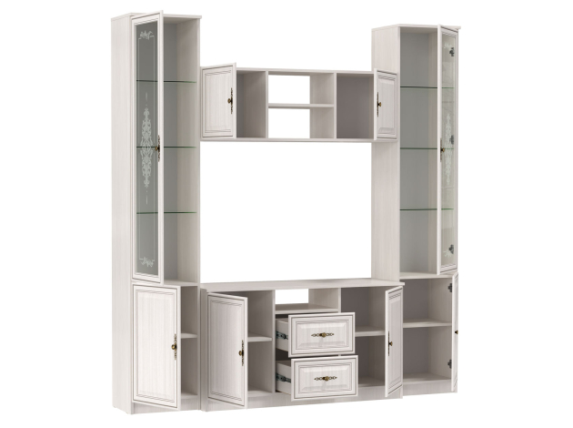 Гостиная Габриэлла предназначена для создания комфортного и элегантного интерьера с продуманной системой хранения. Стеклянные дверцы с узором добавляют обстановке визуальную легкость и особый шарм. Глухие фасады декорированы элегантной фрезеровкой в виде рамок и миниатюрными ручками, что позволяет адаптировать мебель под любой интерьер.