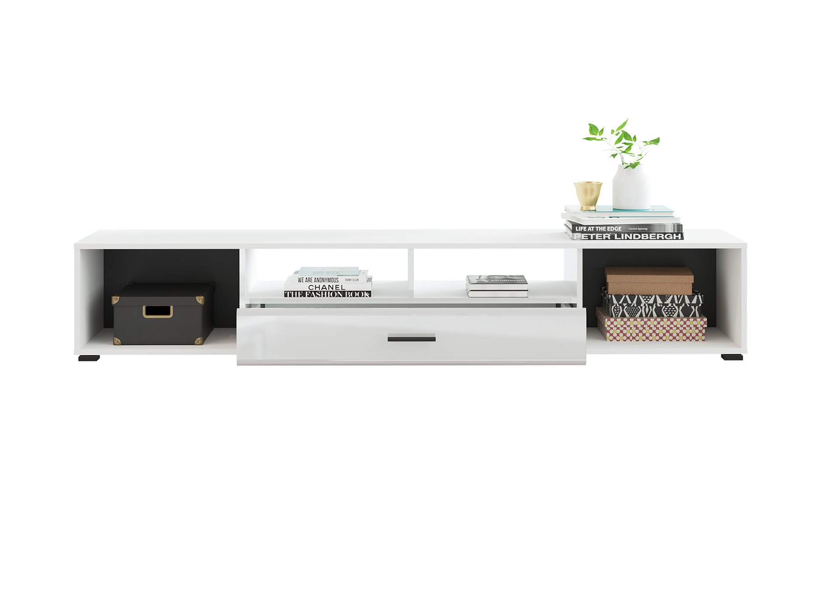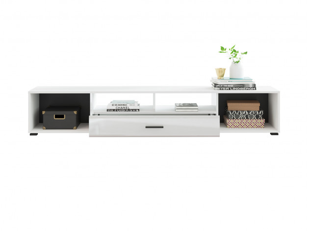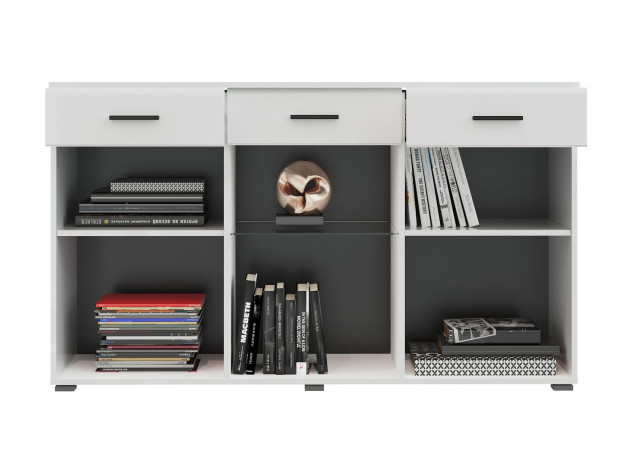 Гостиная Глосс — стильное решение с продуманной системой хранения для современного интерьера. Модули с закрытыми нишами помогут комфортно разместить необходимые вещи, а стеклянные вставки с черным кантом по периметру подчеркнут привлекательность сувениров, книг или предметов декора.