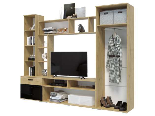 Гостиная Крокус станет отличным вариантом для обустройства ТВ-зоны и хранения всех необходимых вещей. Открытые полки позволят оживить обстановку аксессуарами, фотографиями в рамках и комнатными растениями. Стеклянная дверца откроет обзор на содержимое, защищая его от пыли и влаги. Для хранения одежды предусмотрено вместительное отделение с продольной штангой для вешалок и антресольной полкой, а также несколько закрытых отделений.