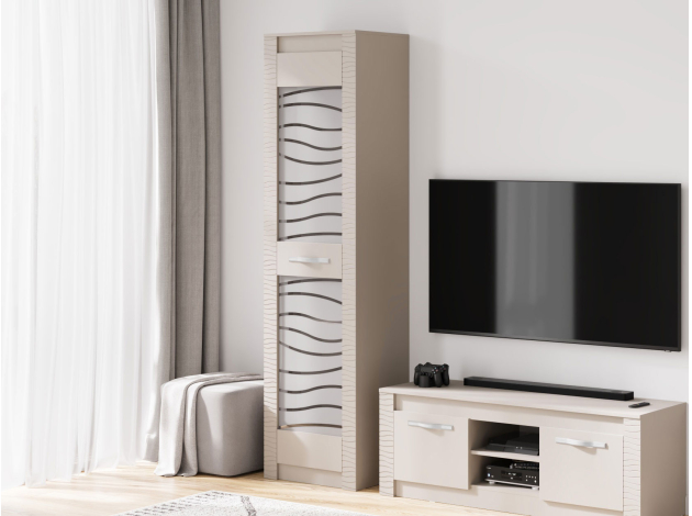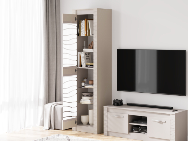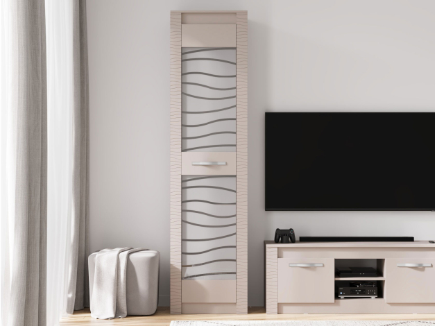 Гостиная Монако Макси позволит создать порядок и идеальную симметрию в интерьере. Продуманные элементы обеспечат место для одежды, книг, аудио- и видеотехники, а также помогут расположить на виду стильный декор. Сочетание открытых ниш, глухих и витринного фасадов правильно расставит акценты, чтобы обустроить уютный уголок, где будет приятно проводить время.