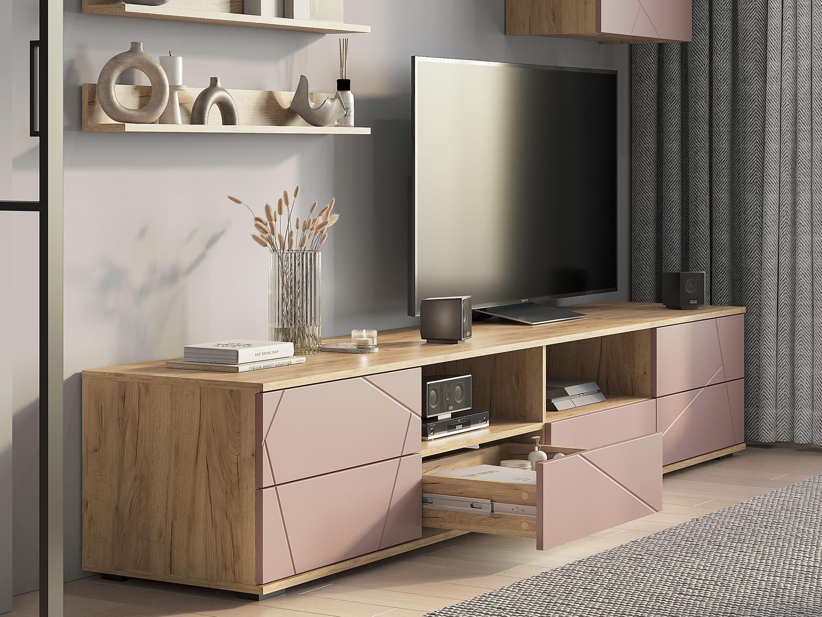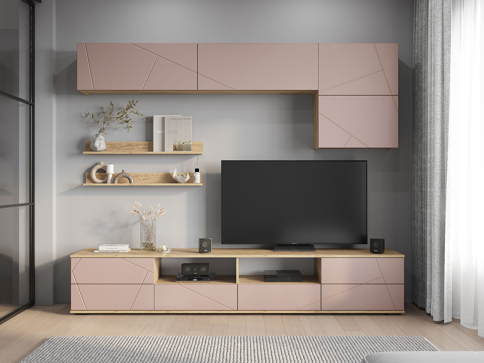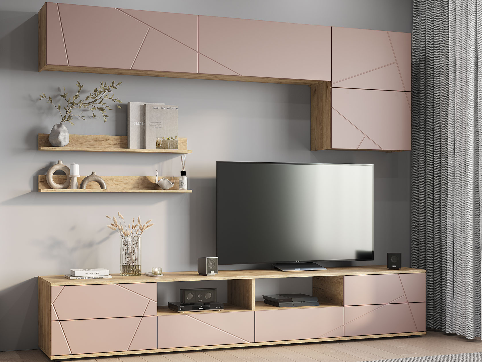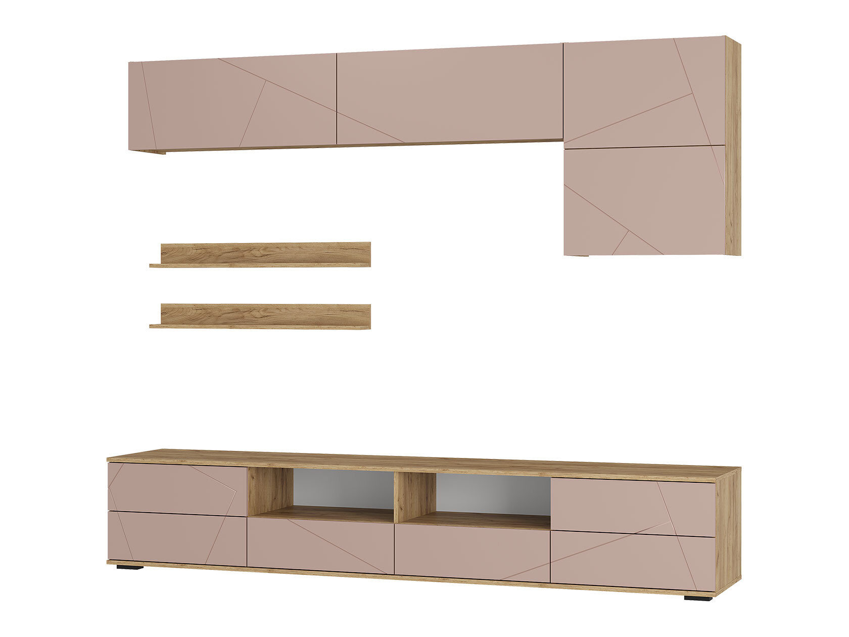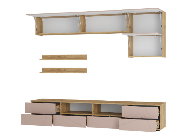 Гостиная Камелия поможет оформить комфортное пространство, где будет приятно расслабиться и отдохнуть. Практичная мебель послужит для организации удобного хранения вещей и обеспечит место для широкоформатного телевизора. Сочетание открытых полок и ниш за глухими фасадами создает строгую симметрию. Стильная фрезеровка на дверцах украсит интерьер.