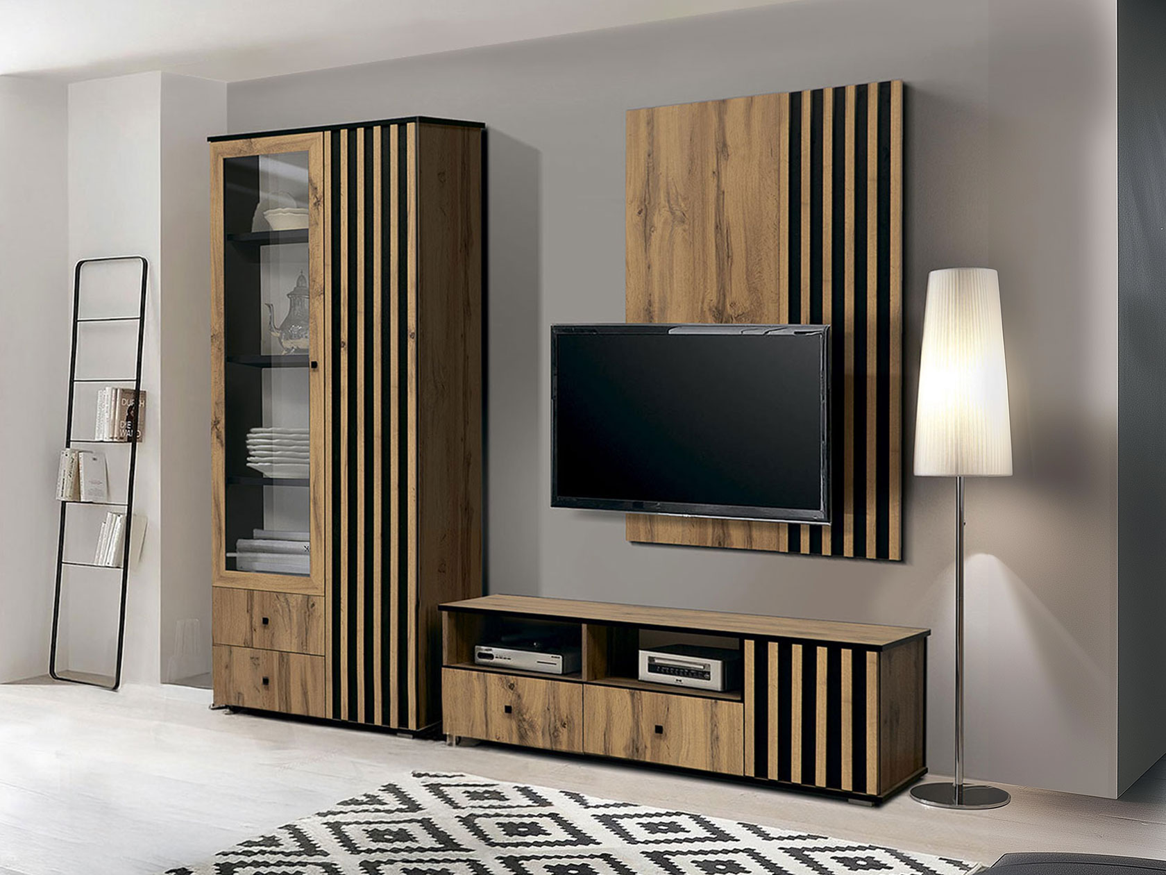 Гостиная Либерти Дуо — продуманное сочетание элементов, которое сделает интерьер привлекательным и функциональным. Практичная мебель с разноплановыми зонами для хранения создаст гармоничную атмосферу и обеспечит удобное место для каждой вещи. Текстура дерева вносит теплые нотки в обстановку комнаты, а реечные фасады добавляют пространству динамики.