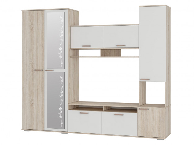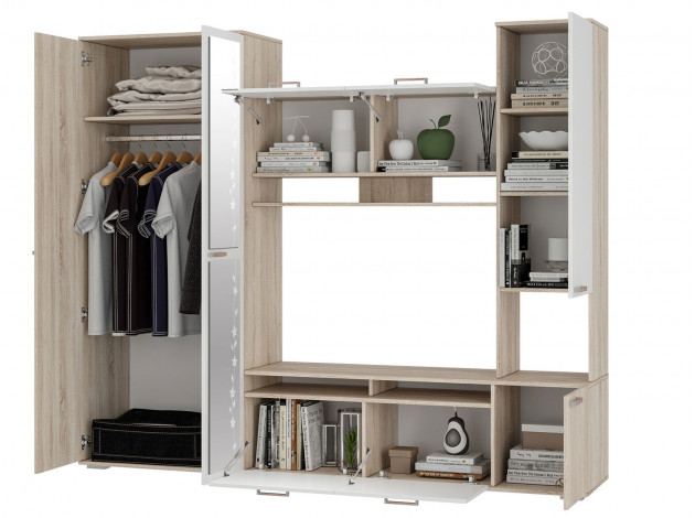 Гостиная Лукас — компактное и одновременно функциональное решение, которое расширит домашнюю систему хранения, позволит разместить телевизор и украсить комнату аксессуарами. Комбинированное наполнение подразумевает множество полок за распашными и откидными фасадами для хранения сложенной одежды, белья и других вещей, а также просторное отделение со штангой для вешалок. Зеркало в полный рост поможет оценить подобранный образ и визуально расширит пространство.