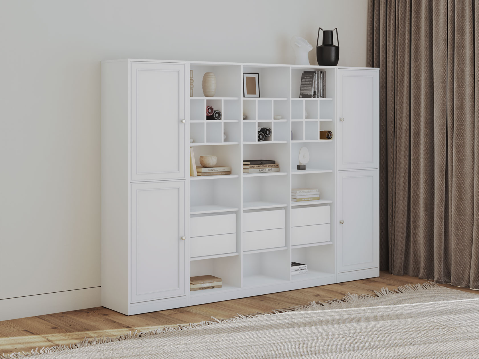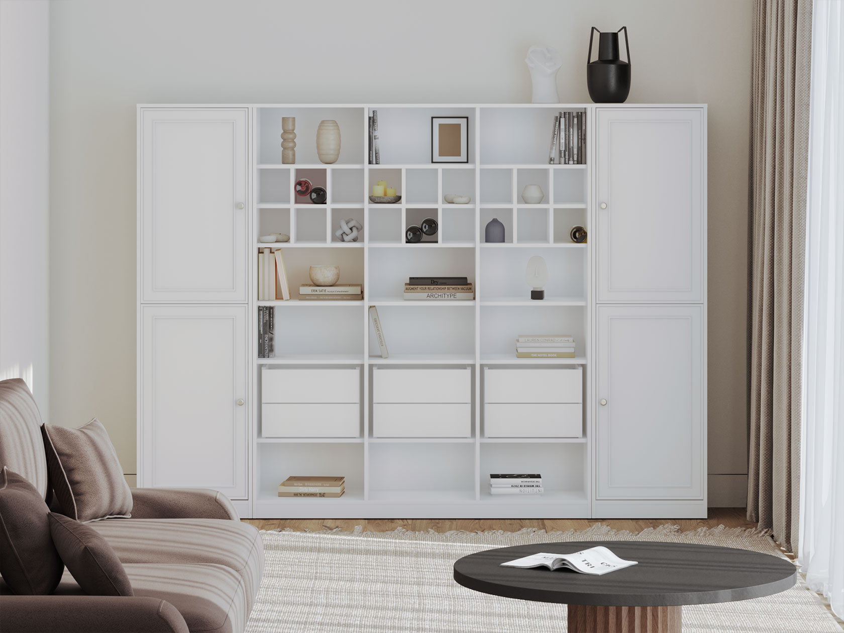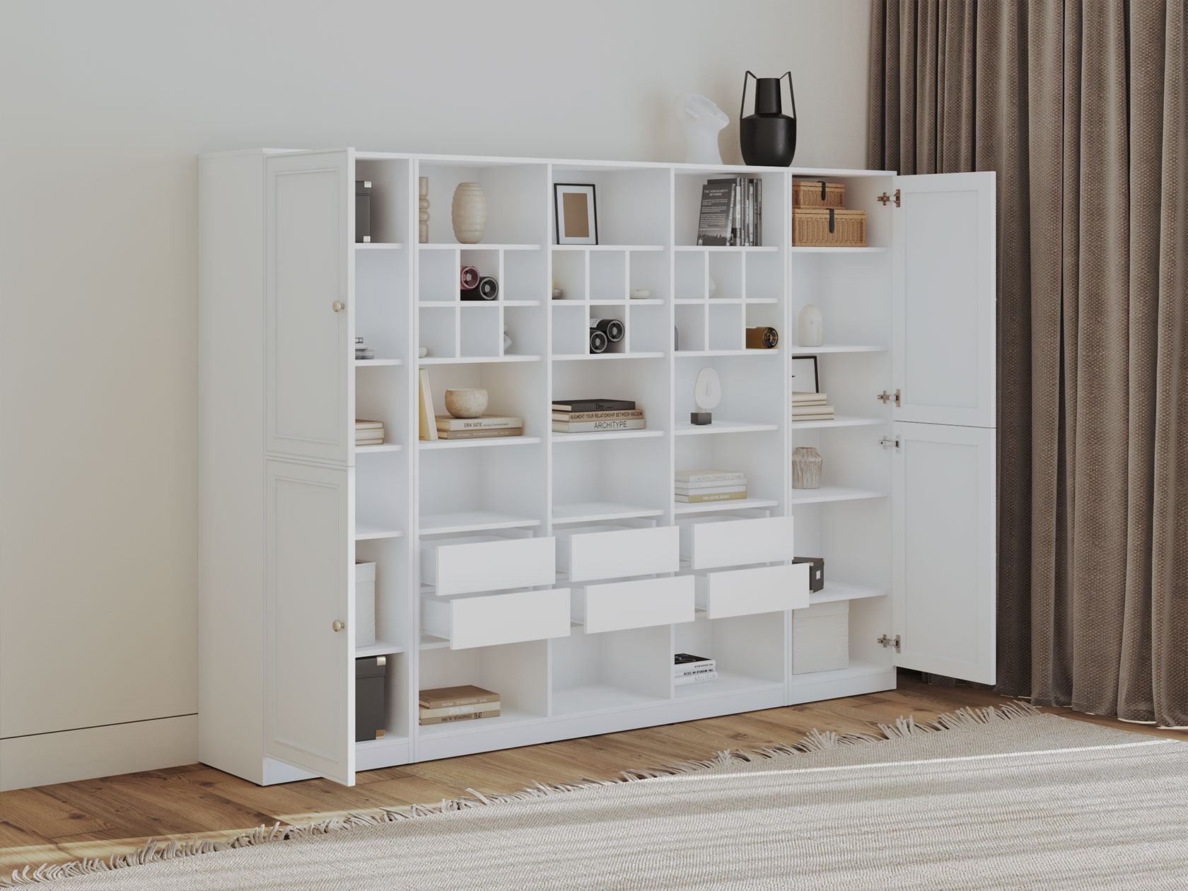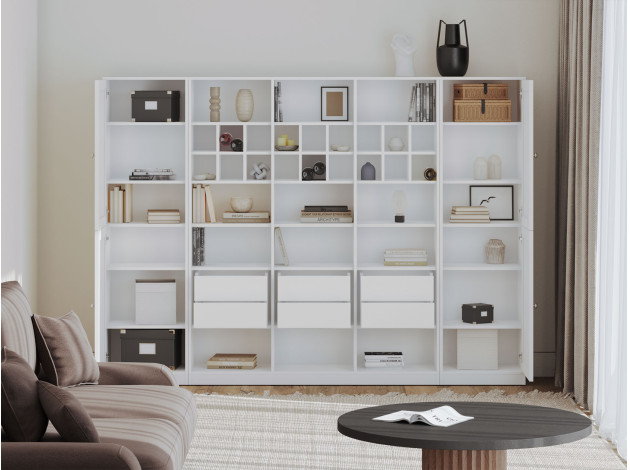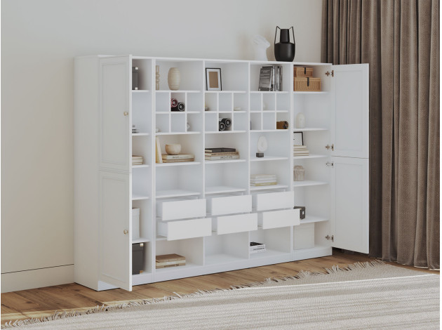 Гостиная Люси со стеллажом поможет поддерживать порядок благодаря продуманным решениям для хранения. Открытые ниши позволяют разместить на виду книги, посуду, декор и другие важные вещи. Распашные шкафы создают удобство при распределении предметов обихода. Изящные рамочные фасады будут уместны в разных стилях меблировки.