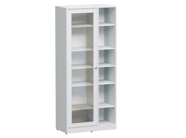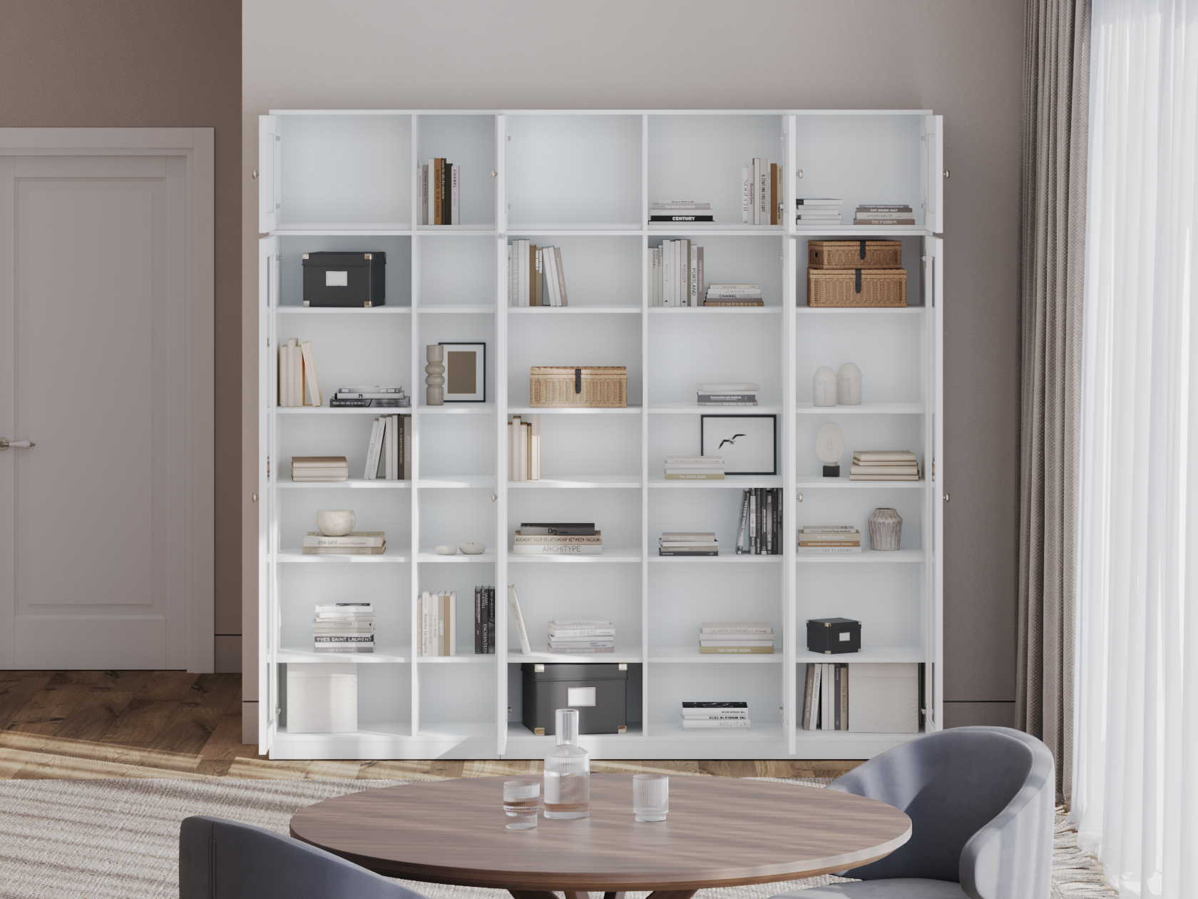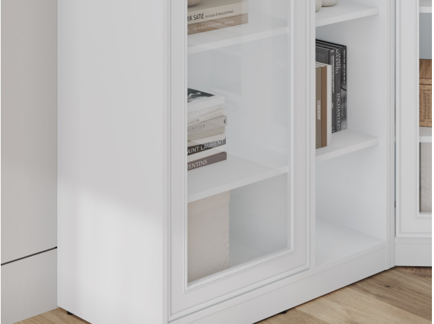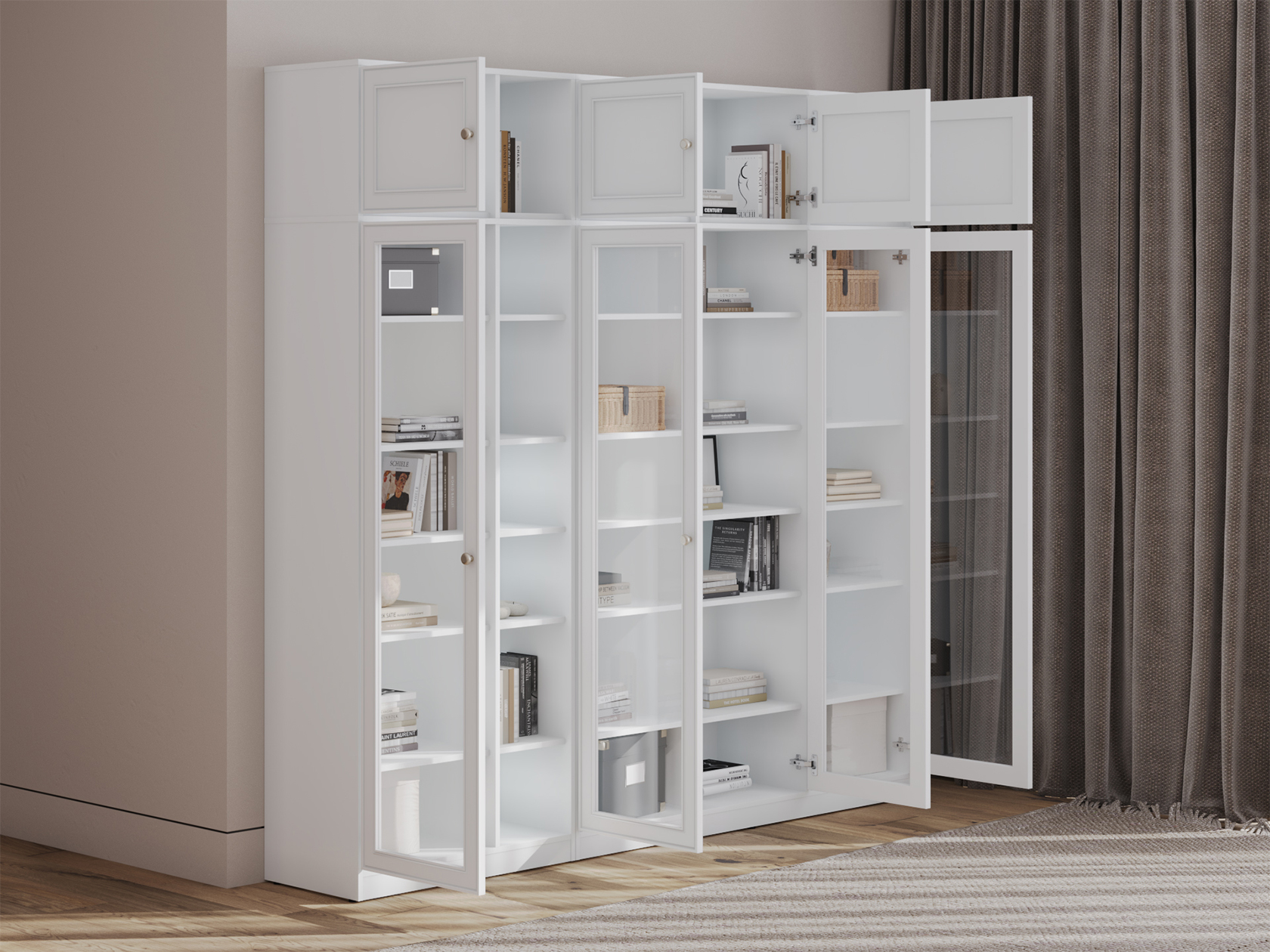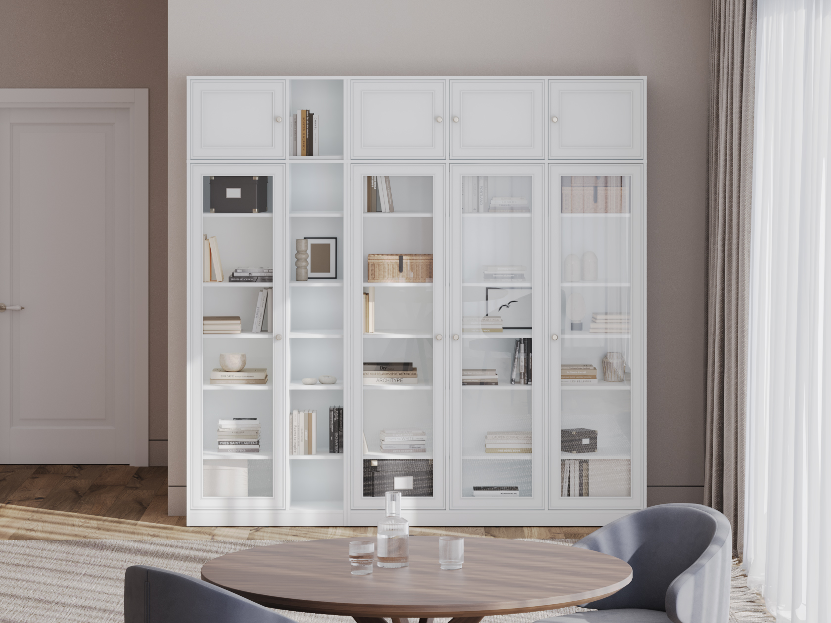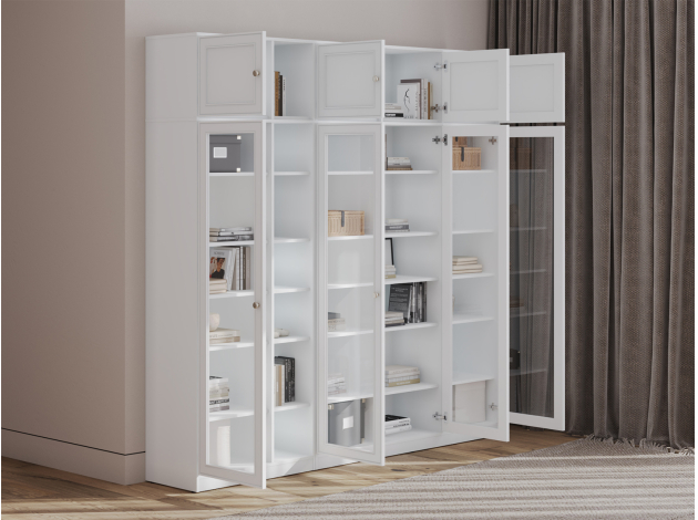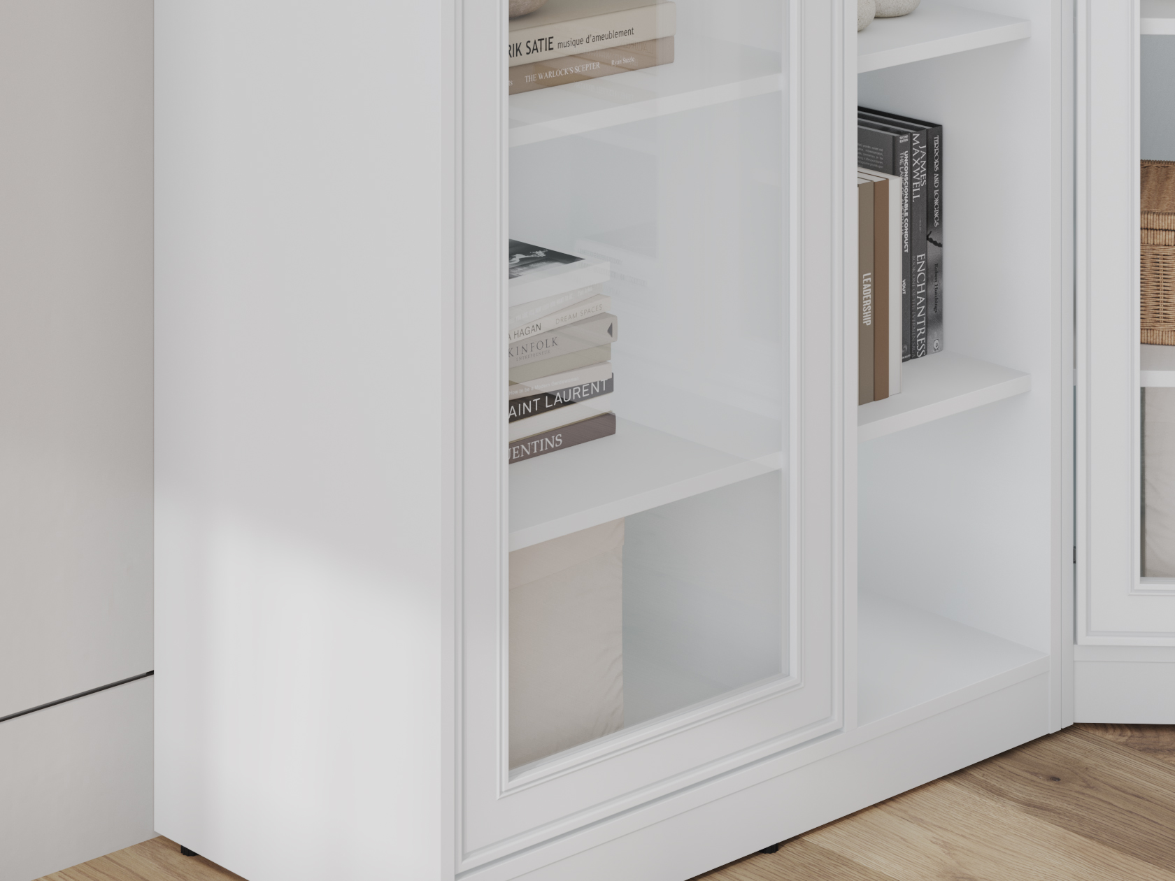 Гостиная Люси Макси с витринами украсит интерьер домашнего кабинета или станет практичным дополнением офисного пространства. В наборе есть всё необходимое, чтобы разместить книги, посуду, коллекцию статуэток, личные награды и документы. Элегантный минимализм подчеркивают рамочные фасады и дверцы из прозрачного стекла, которые защищают содержимое от пыли и солнечного света.