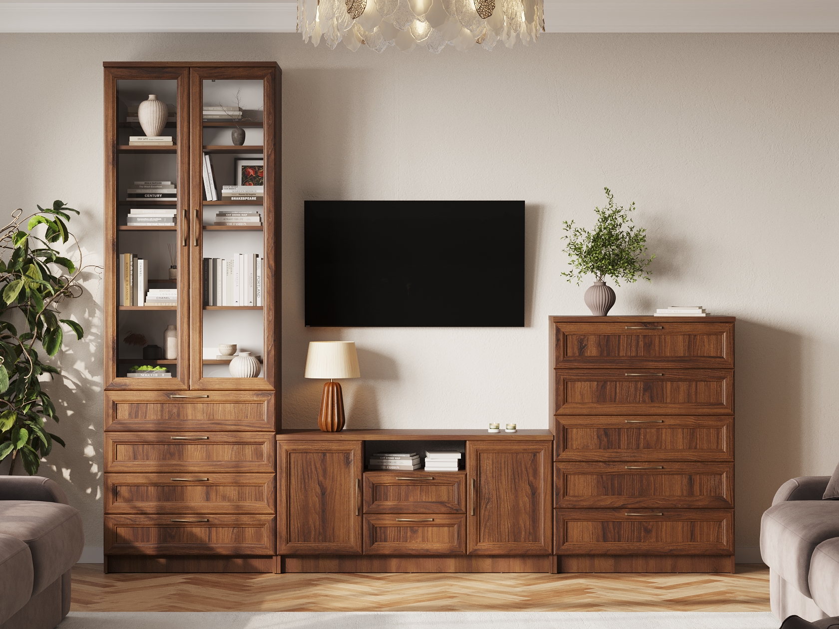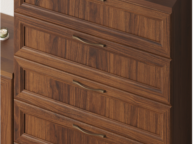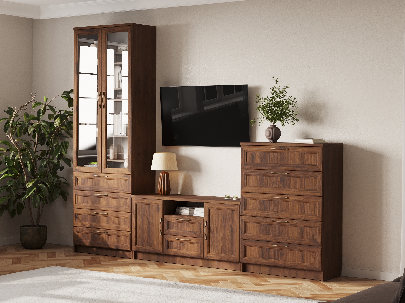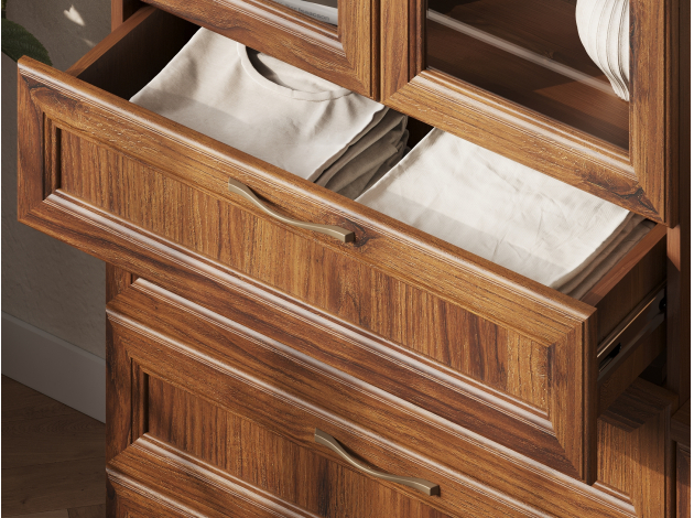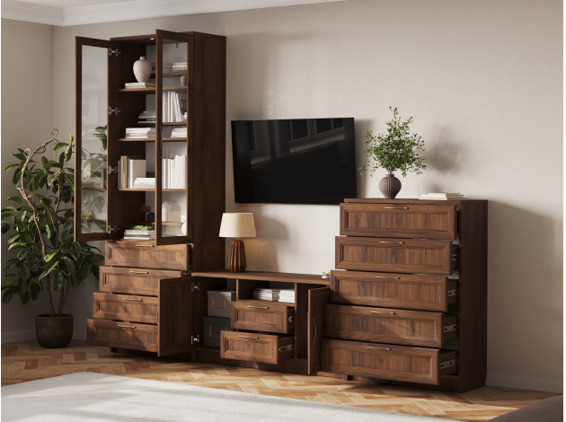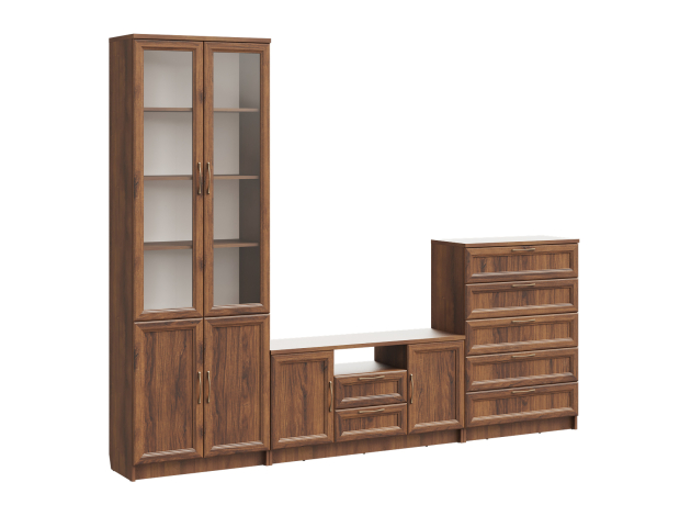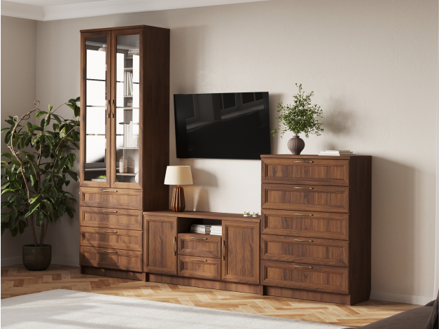 Гостиная Марсель — готовое решение для элегантного интерьера. Стильные фасады под дерево с рамочной фрезеровкой и стеклянными вставками добавляют пространству статусности и индивидуальности. В ящиках и на полках можно разместить посуду, книги, элементы декора и другие необходимые вещи. Вырез под плинтус позволяет установить мебель вплотную к стене.