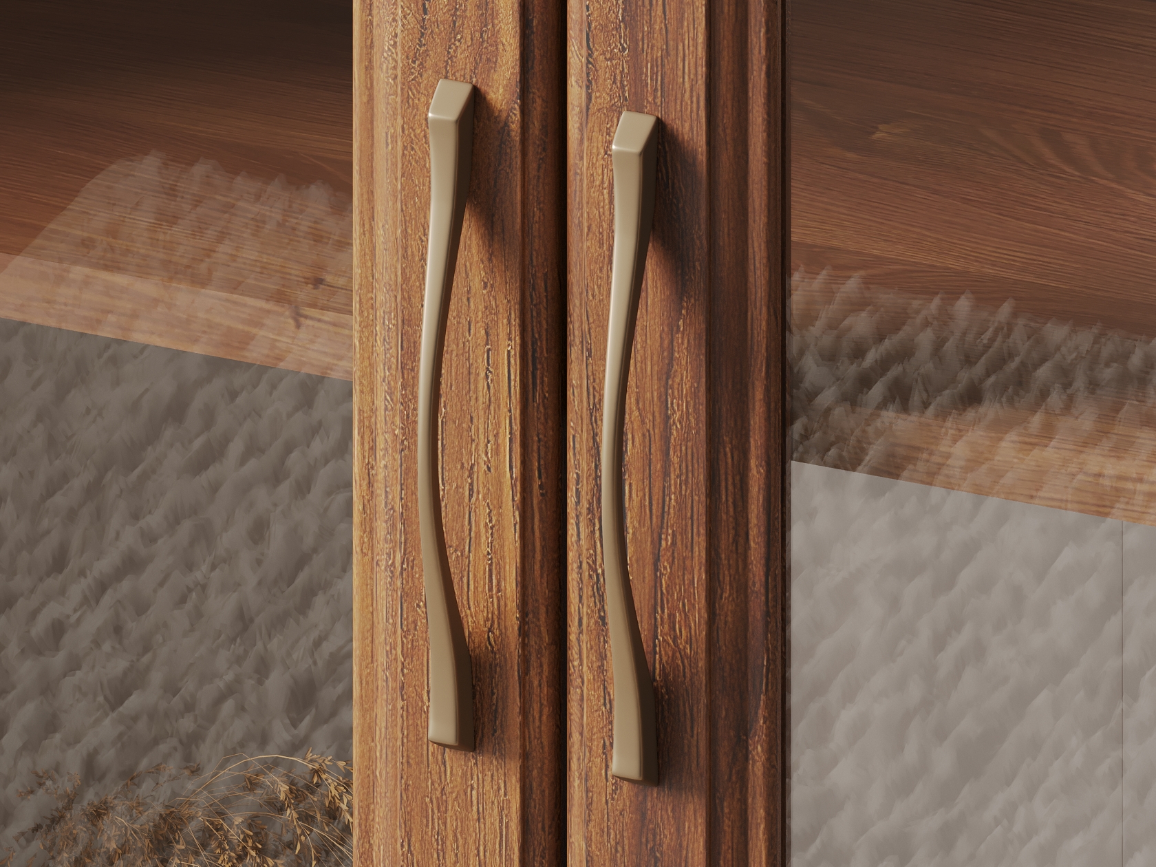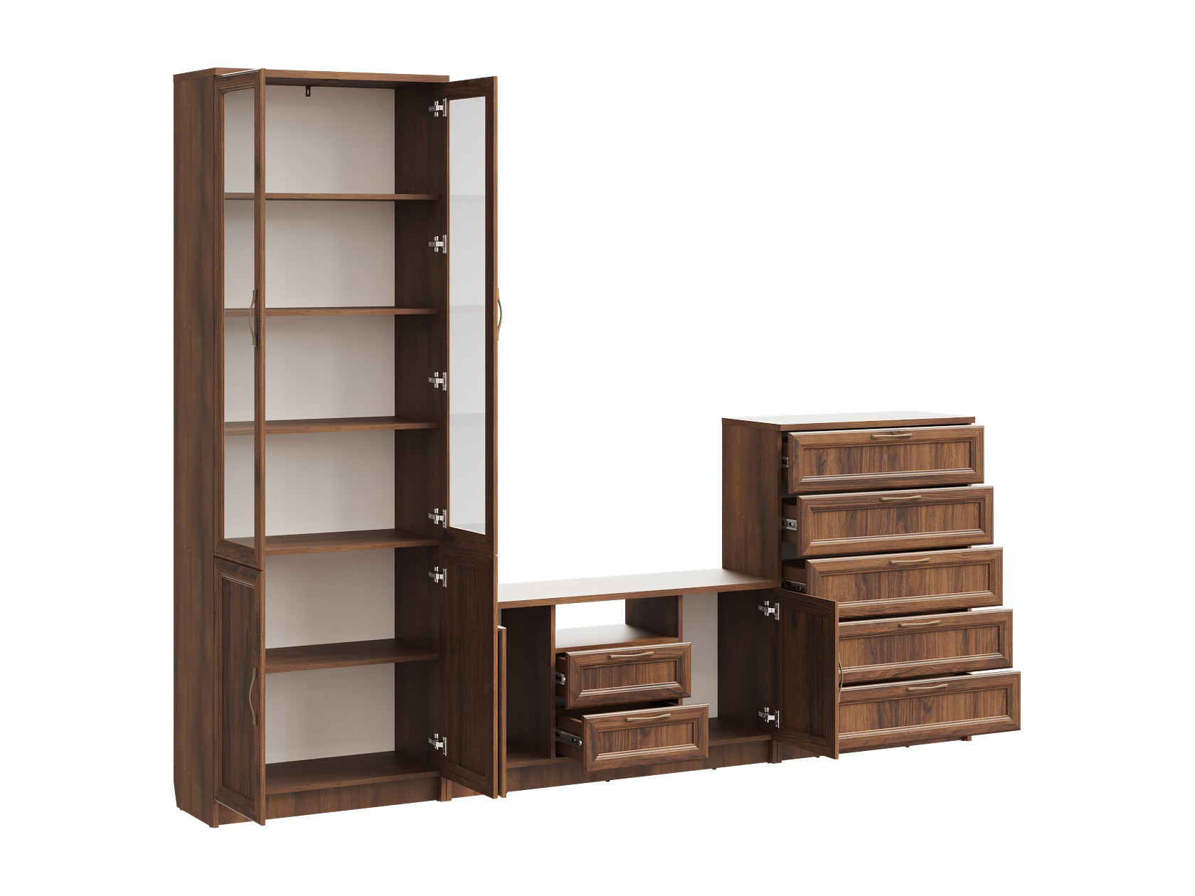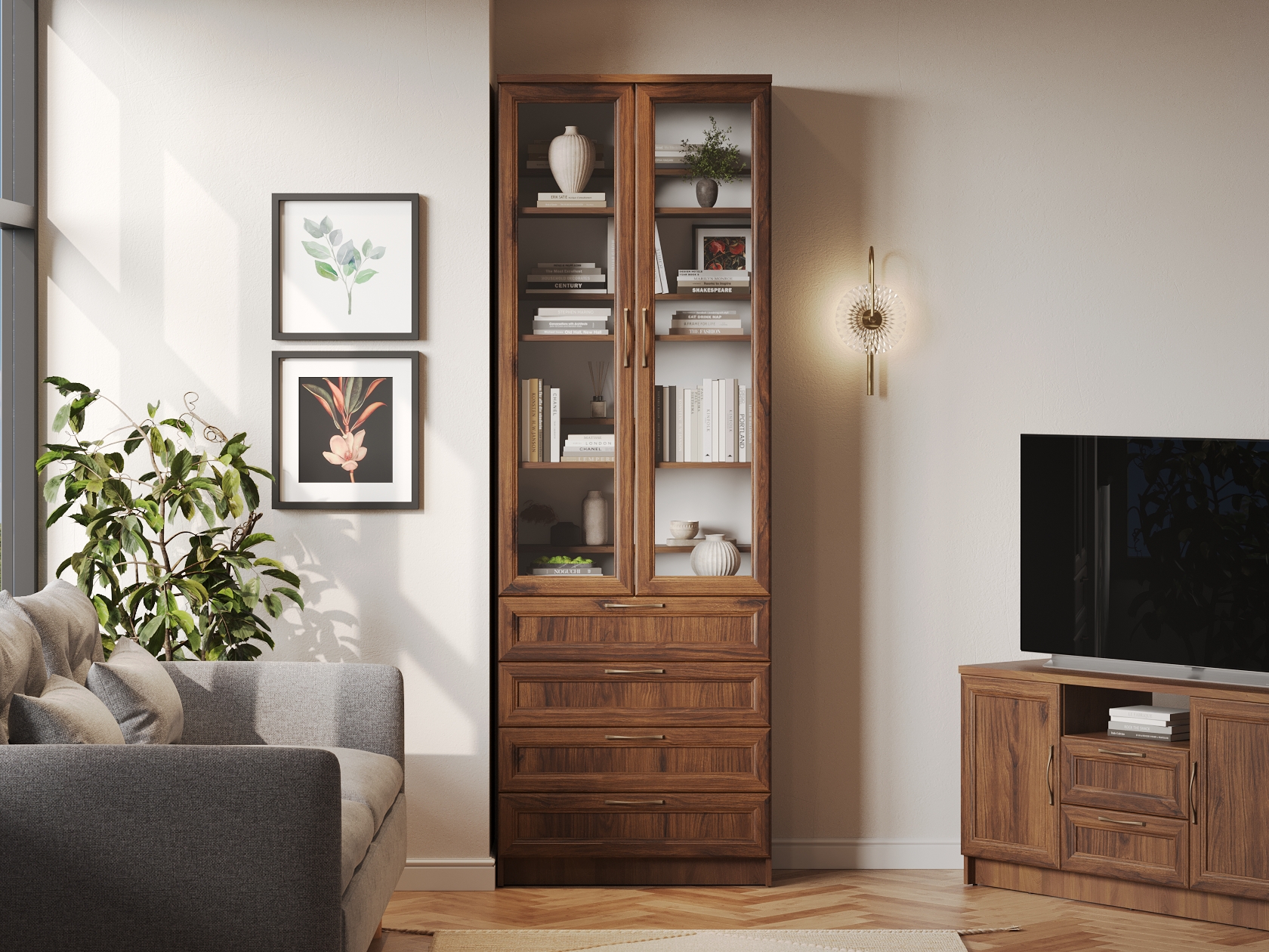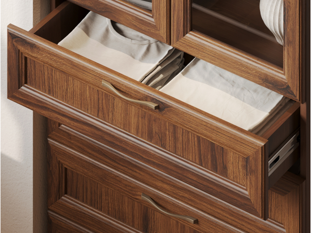 Гостиная Марсель — готовое решение для элегантного интерьера. Стильные фасады под дерево с рамочной фрезеровкой и стеклянными вставками добавляют пространству статусности и индивидуальности. В ящиках и на полках можно разместить посуду, книги, элементы декора и другие необходимые вещи. Вырез под плинтус позволяет установить мебель вплотную к стене.