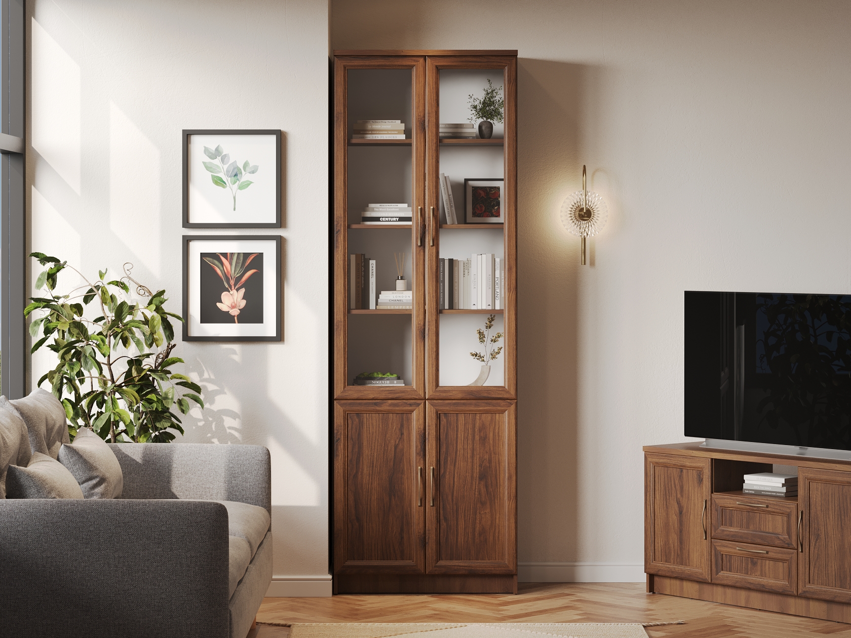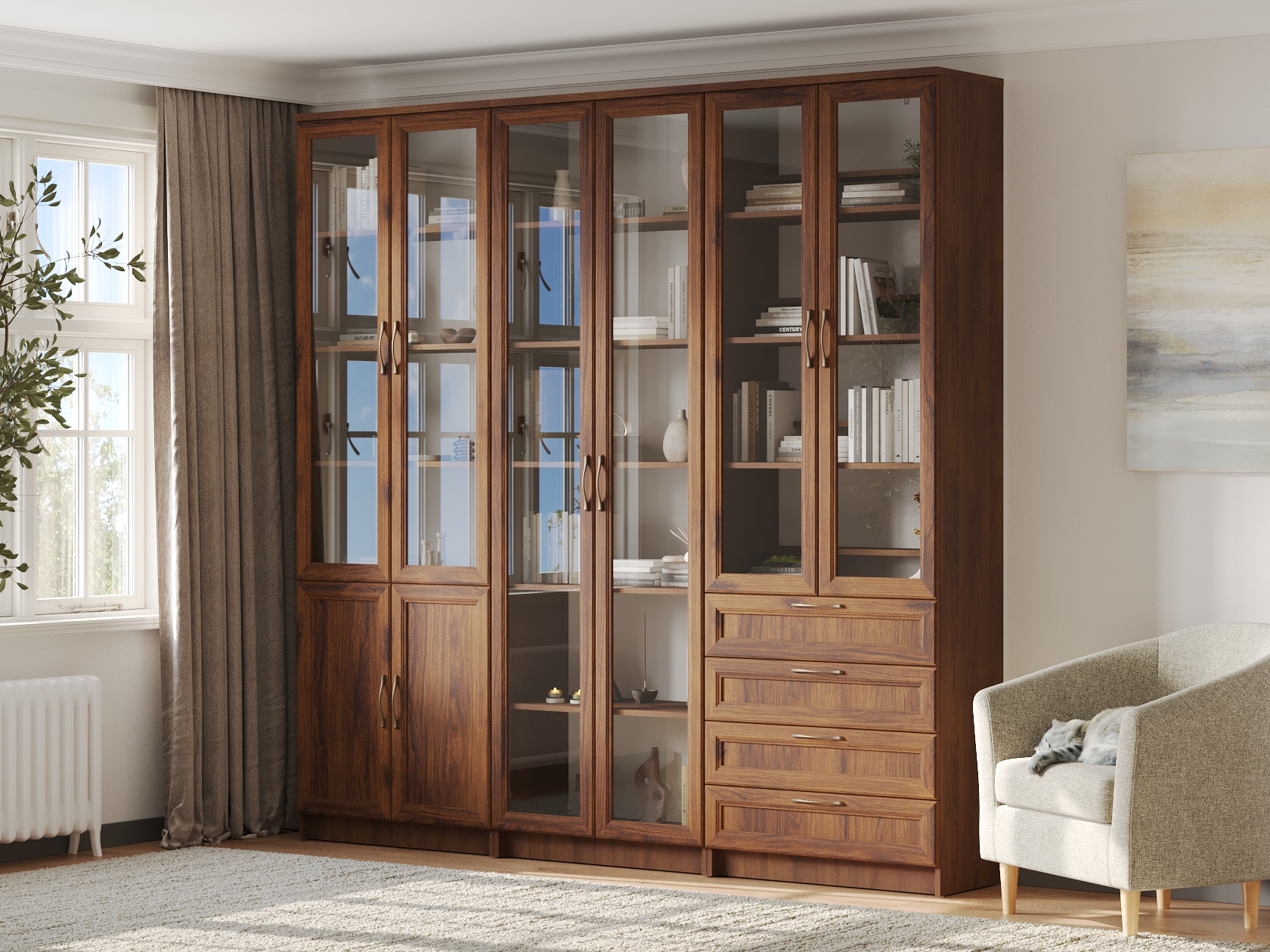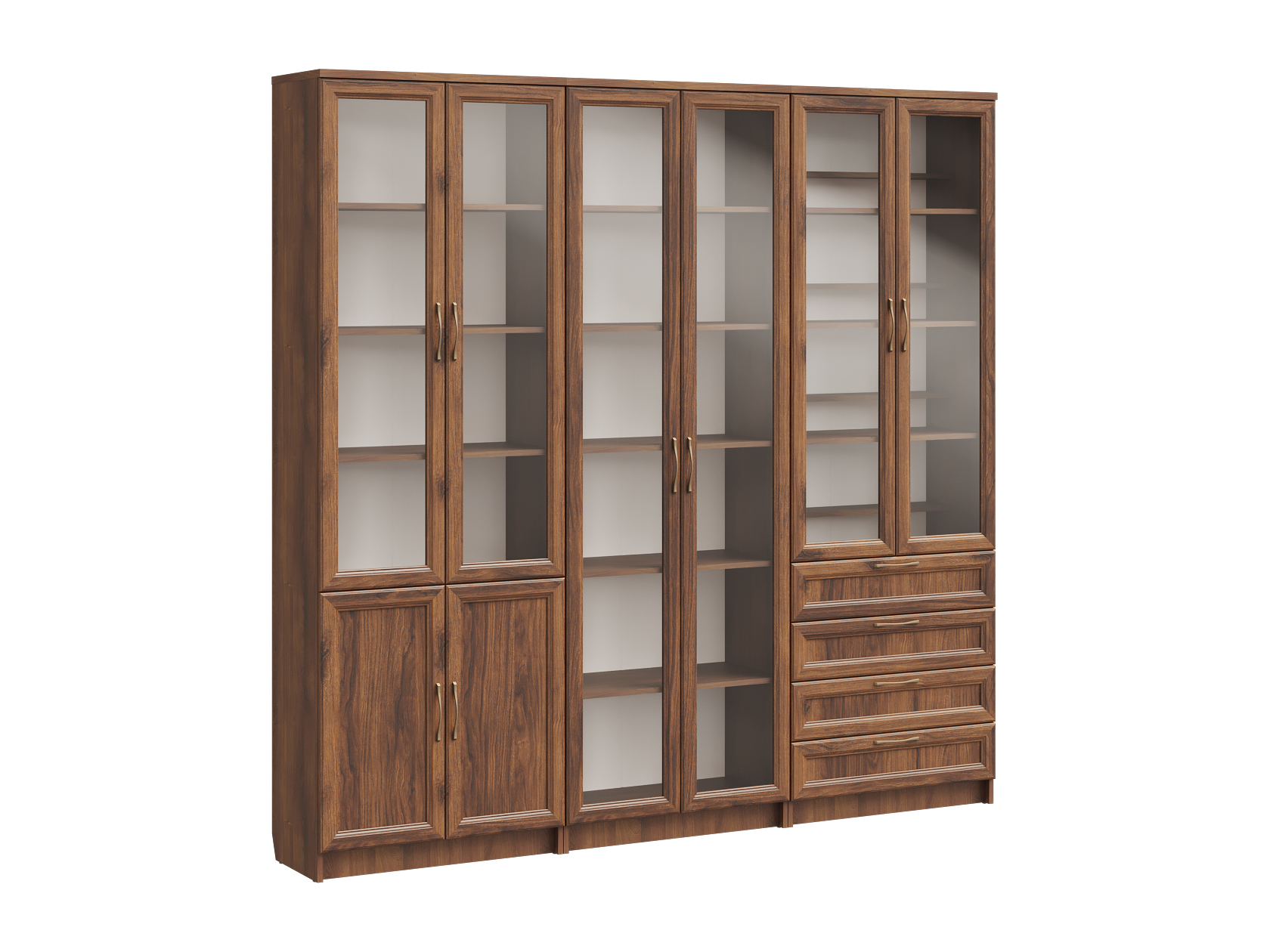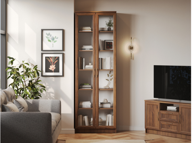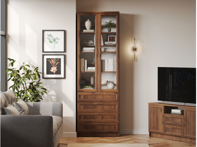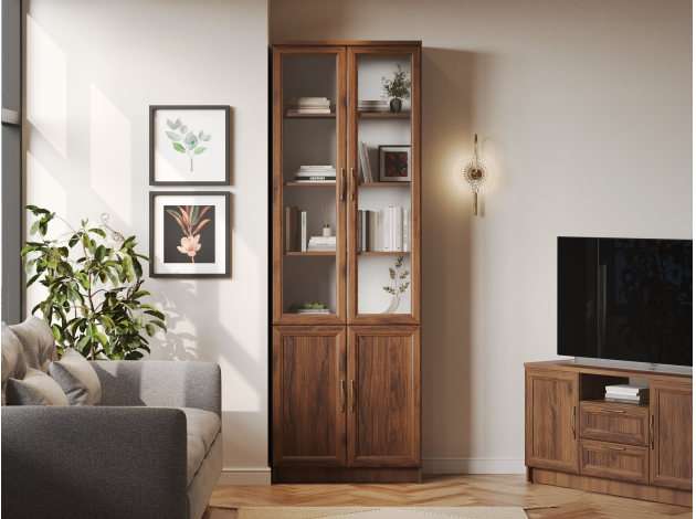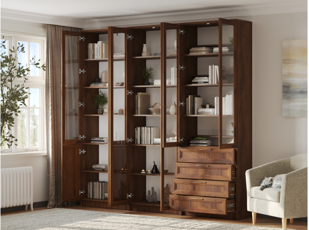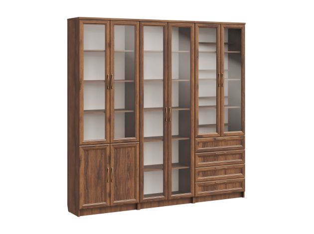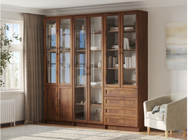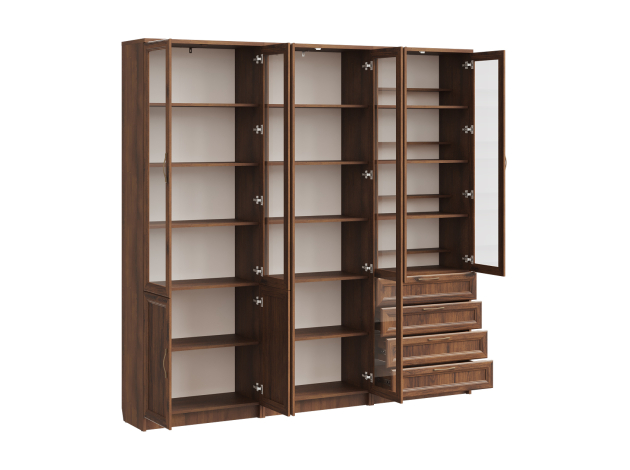 Библиотека Марсель — стильный и вместительный набор, который позволяет распределить книги, журналы, документы и ценные предметы из личной коллекции. Витрины и глухие дверцы защищают содержимое от пыли и воздействия солнечных лучей. Рамочные фасады с изящными ручками гармонично сочетаются с классическим стилем меблировки. Доводчики и направляющие с плавным ходом обеспечивают комфортную эксплуатацию.