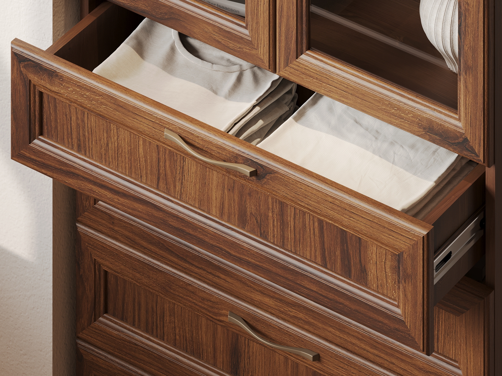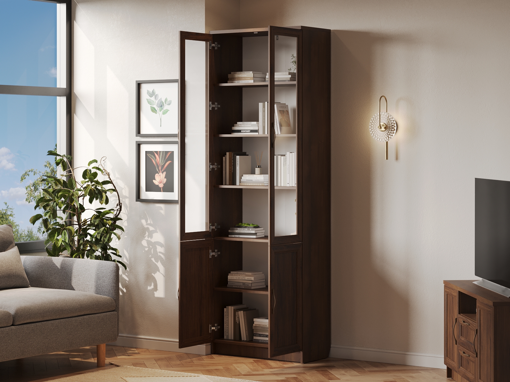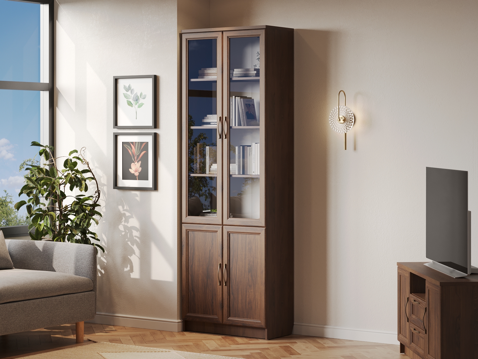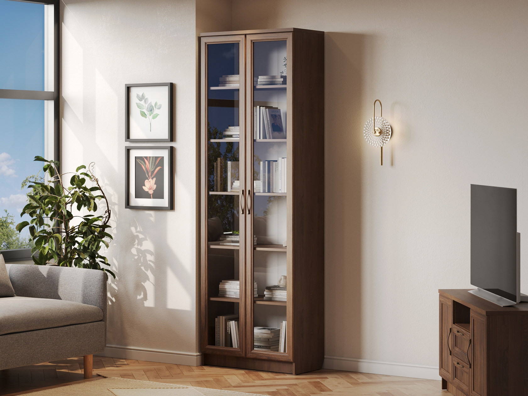 Библиотека Марсель — стильный и вместительный набор, который позволяет распределить книги, журналы, документы и ценные предметы из личной коллекции. Витрины и глухие дверцы защищают содержимое от пыли и воздействия солнечных лучей. Рамочные фасады с изящными ручками гармонично сочетаются с классическим стилем меблировки. Доводчики и направляющие с плавным ходом обеспечивают комфортную эксплуатацию.