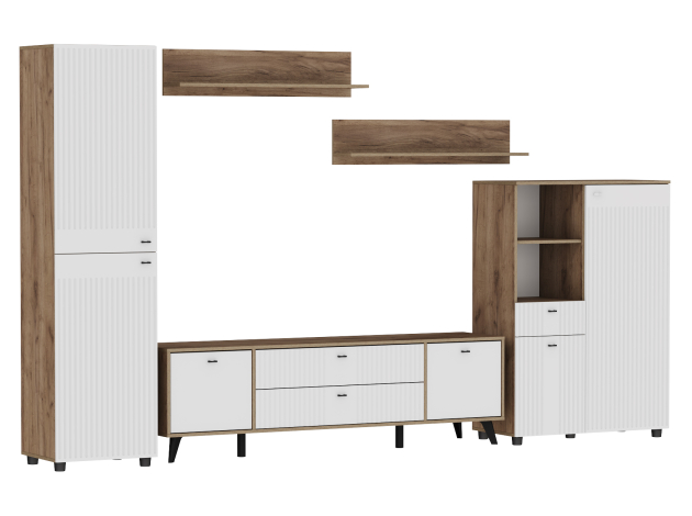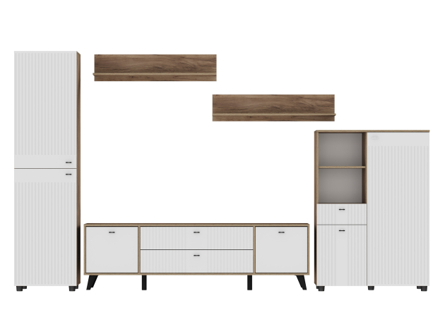Гостиная Милан Стандарт представляет идеальный баланс эстетики и продуманного функционала. В наборе есть всё необходимое для удобного хранения вещей и мультимедийной техники, а также размещения декора. Матовые фасады и изящные ручки подчеркивают утонченность мебели, а сочетание фактуры дерева с вертикальными линиями фрезеровки создает стильный и уютный интерьер.