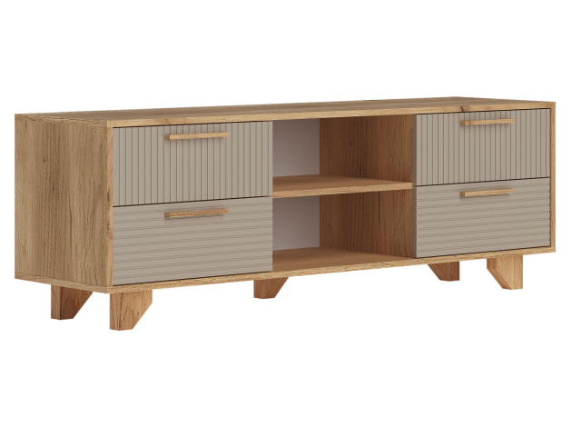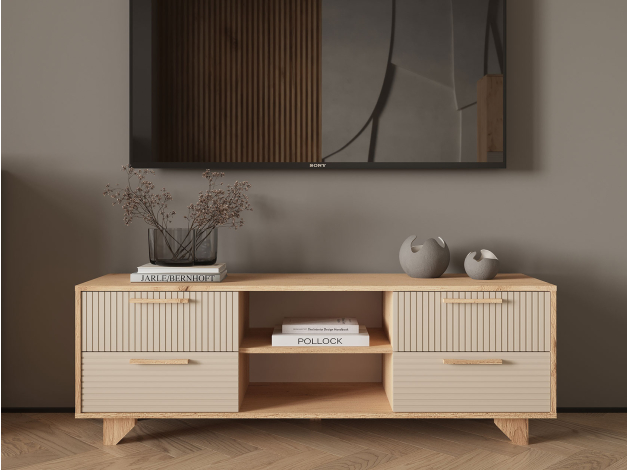 Гостиная Ньерд Макси идеально подойдет для обустройства зоны отдыха в небольшой комнате. Здесь найдется место под телевизор с большой диагональю, а практичный комод позволит держать под рукой необходимые вещи. Открытые ниши удобны для хранения книг и печатной продукции. Природные оттенки, оригинальная фрезеровка и небольшие ножки придают мебели стильный современный облик.