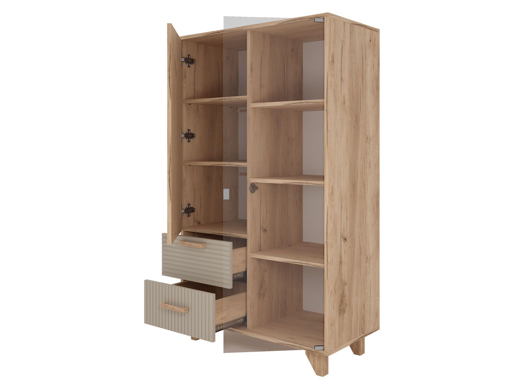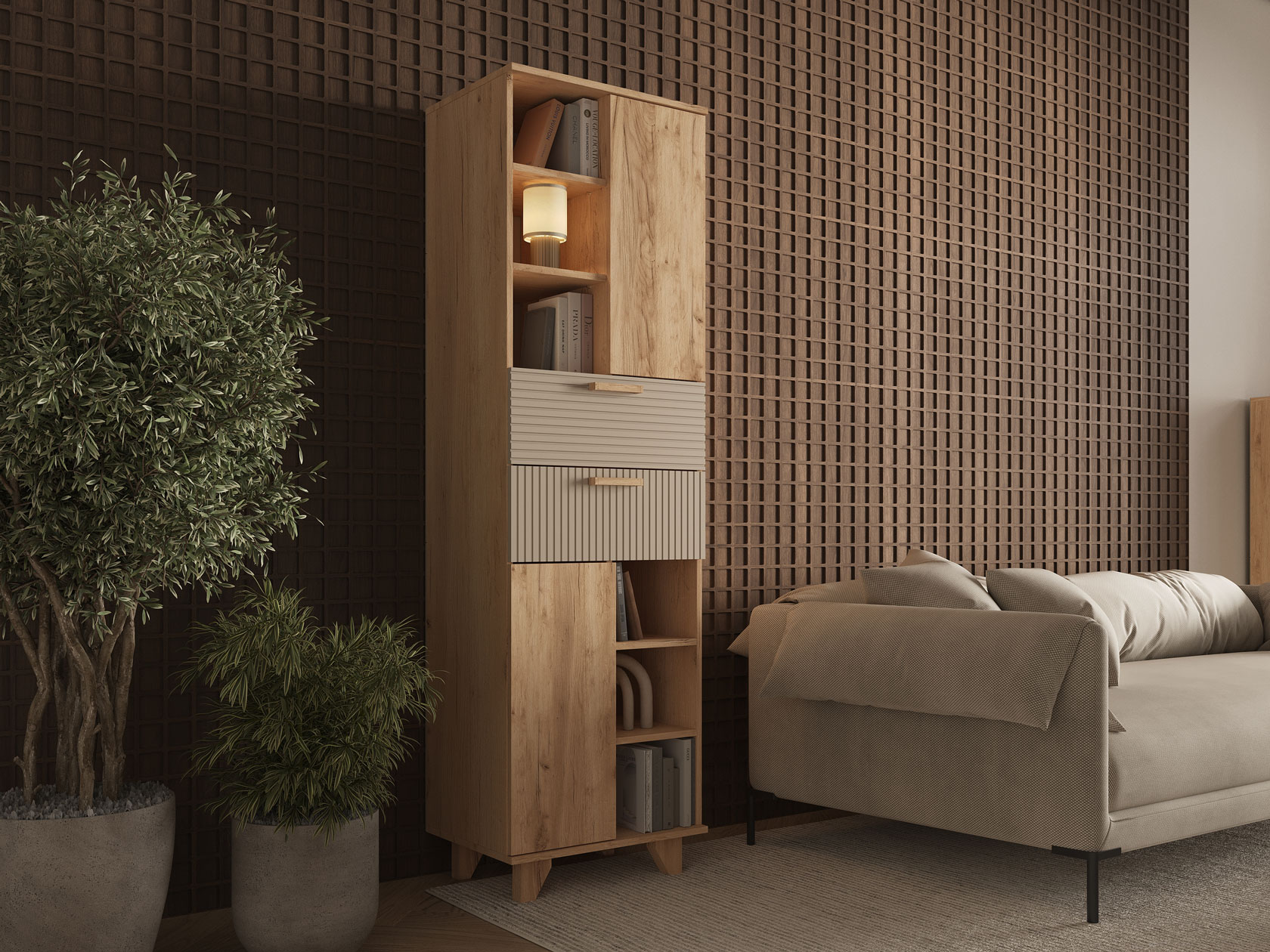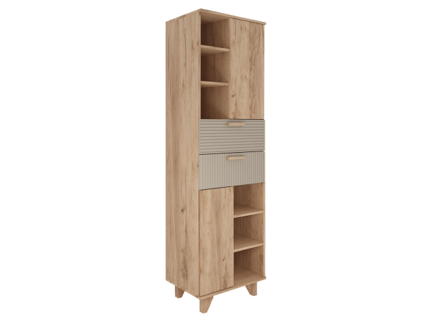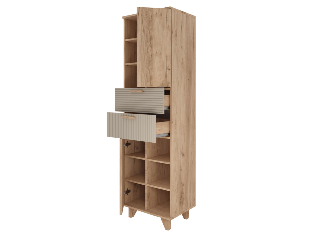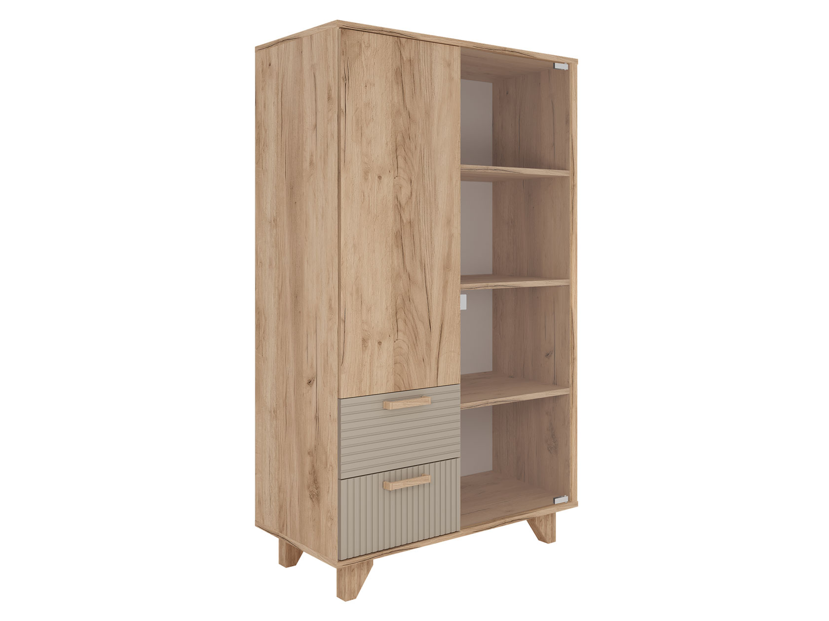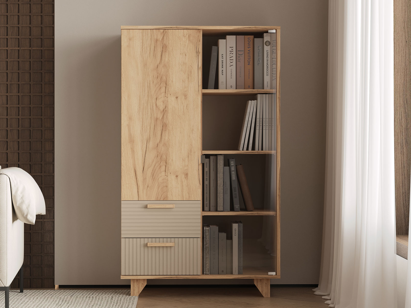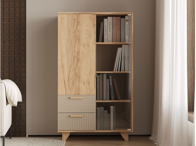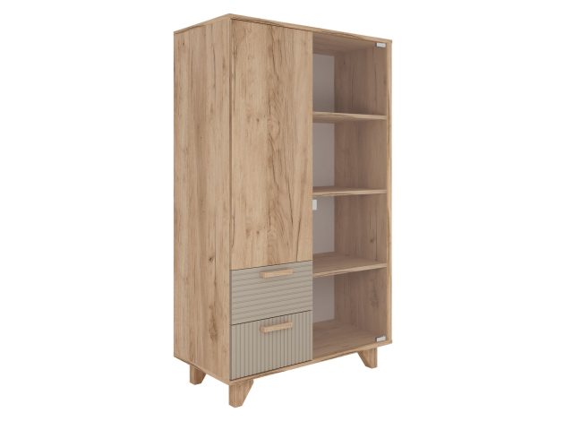 Гостиная Ньерд с витриной поможет обустроить функциональное пространство, где сочетаются изысканность и индивидуальный стиль. Оригинальный шкаф-витрина и вместительный стеллаж позволят удобно расположить всё необходимое. Стеклянная дверца добавит комнате простора и легкости, а древесный декор создаст теплую и уютную атмосферу.