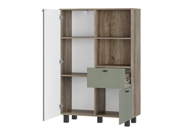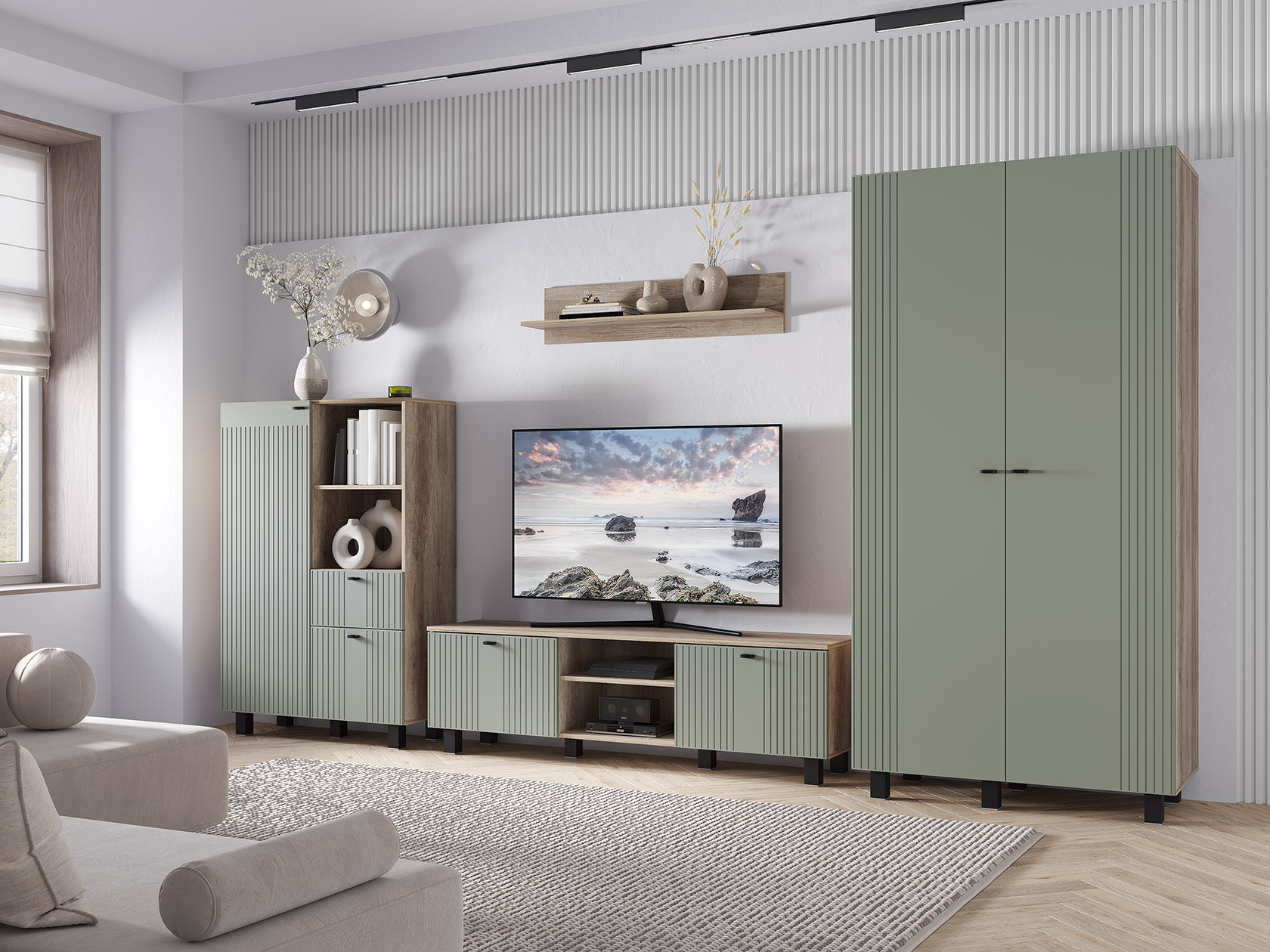 Гостиная Олива со шкафом объединила несколько функциональных элементов, благодаря которым легко поддерживать порядок в комнате. Фрезеровка на фасадах создает интересную фактуру, при этом не перегружает интерьер. Матовая поверхность удачно маскирует частички пыли и отпечатки пальцев, поэтому уход за мебелью не станет сложной задачей.