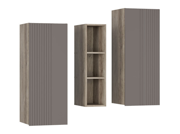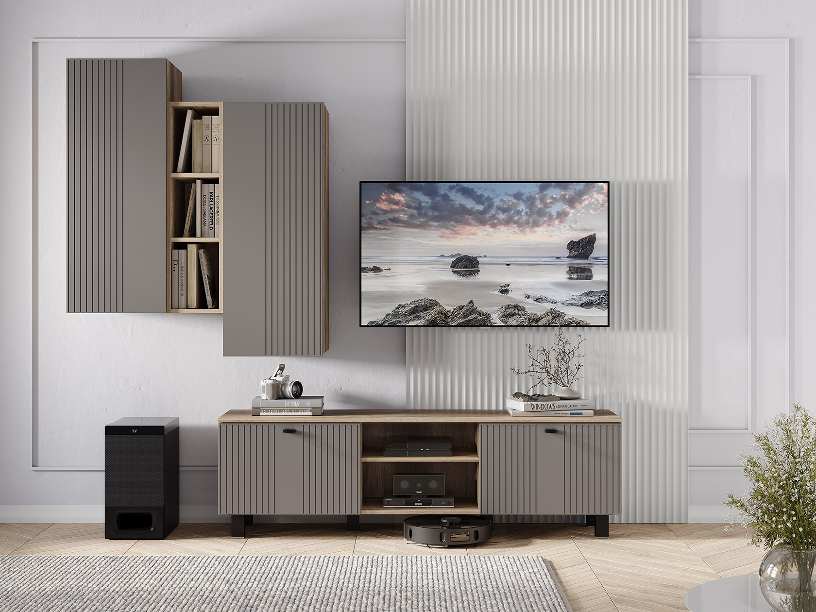Гостиная Олива Мини оформлена в приятных оттенках и актуальном дизайне. Тонкие линии фрезеровки создают интересную фактуру фасадов с особыми ритмом и динамикой. Сочетание открытых и закрытых секций позволяет украсить интерьер книгами и стильным декором, при этом скрыть из виду предметы обихода.