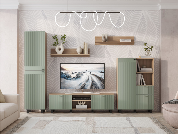 Гостиная Олива станет основой стильного интерьера для отдыха в кругу семьи и встреч с друзьями. Большое количество мест для хранения поможет поддерживать порядок. Фасады с фрезеровкой придают обстановке индивидуальность, а древесный декор наполняет комнату гармонией и уютом.