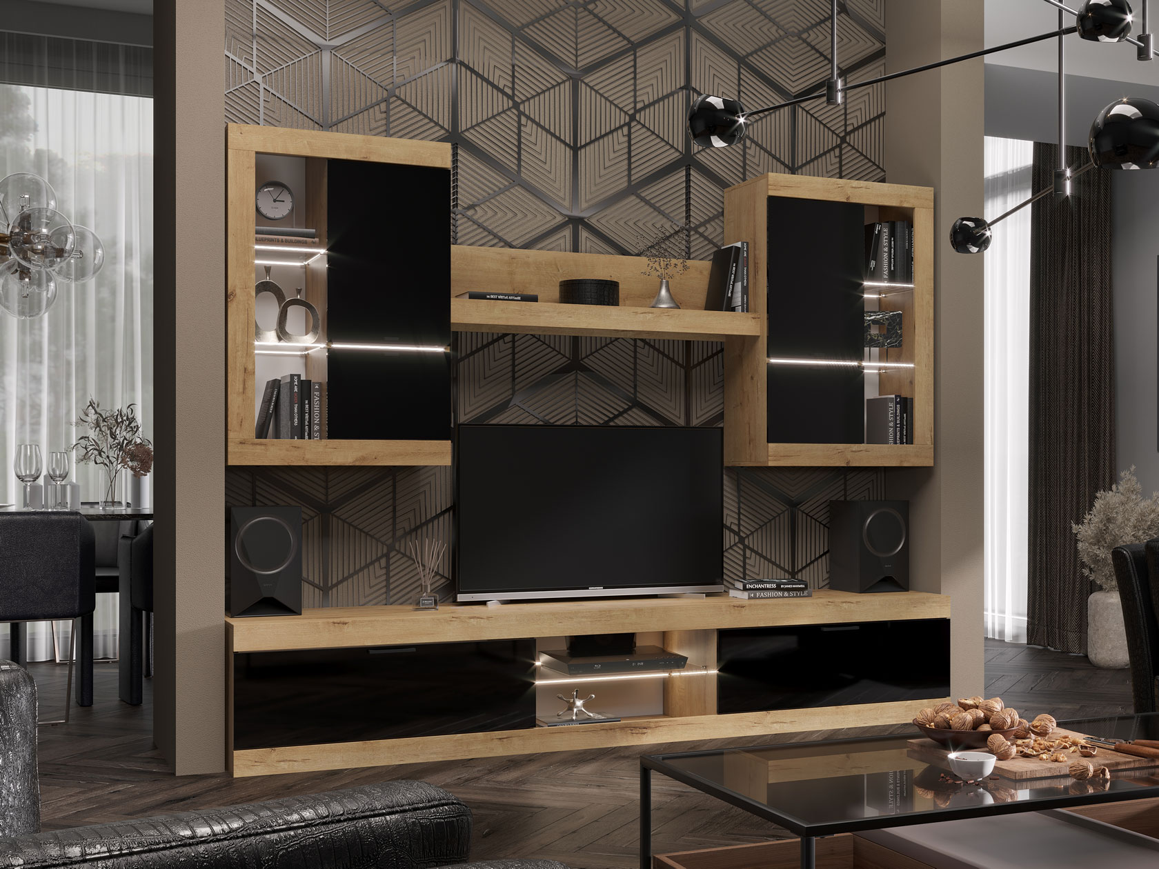 Гостиная Прага подходит для обустройства как просторной, так и небольшой комнаты. Набор мебели позаботится о том, чтобы каждая вещь была на своем месте. Сочетание глухих фасадов и стеклянных полок подчеркивает индивидуальность пространства, но в то же время не перегружает интерьер лишними деталями.