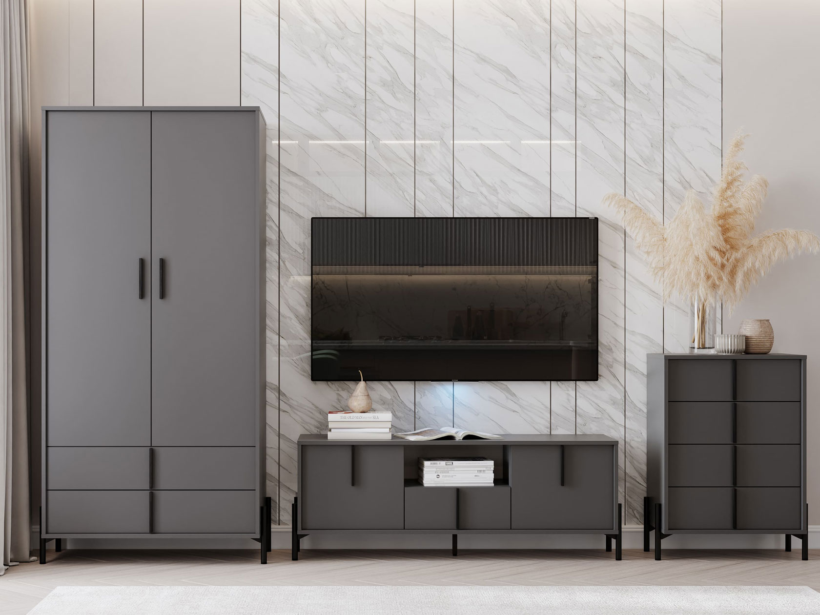 Гостиная Тео со шкафом — функциональное решение для организации уютного уголка для отдыха и просмотра фильмов. Практичный набор мебели поможет распределить вещи по категориям и упростит поддержание порядка в комнате. На открытых поверхностях удобно поставить ночник, вазы для цветов и предметы декора. Небольшие ножки в цвет фурнитуры придают обстановке визуальную легкость.