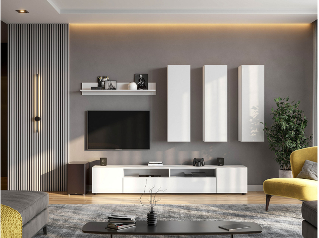 Гостиная Токио выполнена в стильном минималистичном дизайне с преобладанием строгих линий. Внутреннее наполнение представлено вместительными отделениями за глухими фасадами и удобными открытыми нишами.