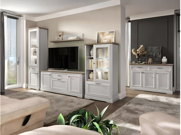 Гостиная Тоскана Нью — эстетичное решение с удобной системой хранения. Мебель позволяет аккуратно разместить мультимедийную технику, книги, документы и другие нужные вещи. Декоративные планки в виде объемных рамок и акцентные ручки придают фасадам по-настоящему элегантный вид. Шкафы-витрины с возможностью выбора подсветки создают особую изюминку интерьера.