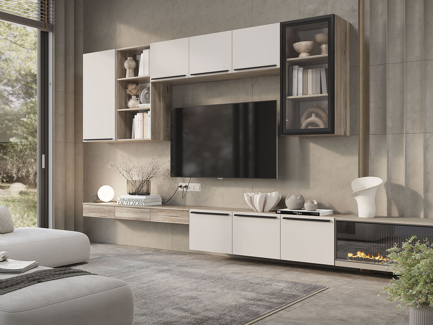 Гостиная Урбан Макси с ящиками позволит расположить личные вещи и организовать полноценную ТВ-зону. Разнообразие зон для хранения обеспечит место для книг, личных вещей, декора и других полезных мелочей. Имитация фактуры дерева и матовые фасады со вставками из прозрачного стекла создают актуальный и стильный облик мебели.