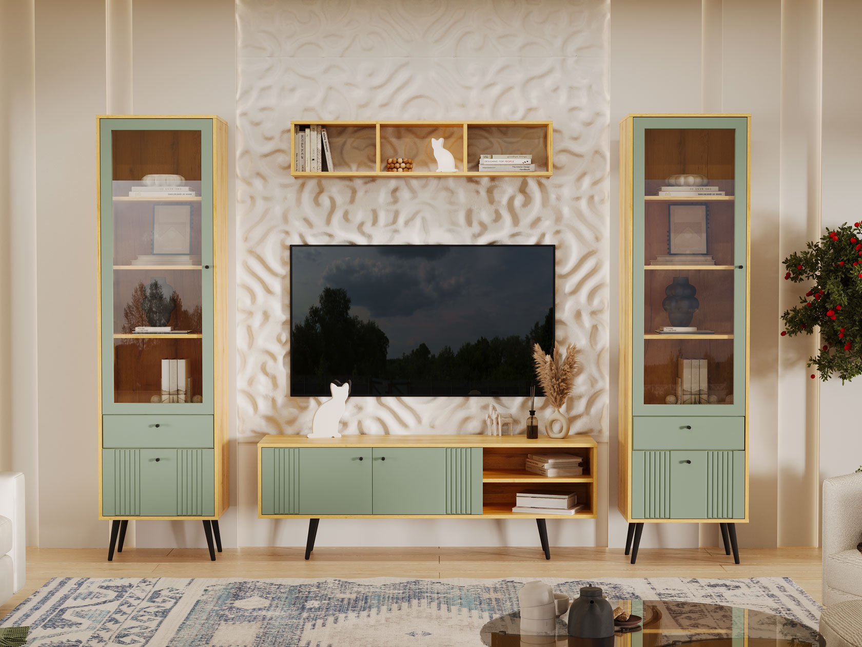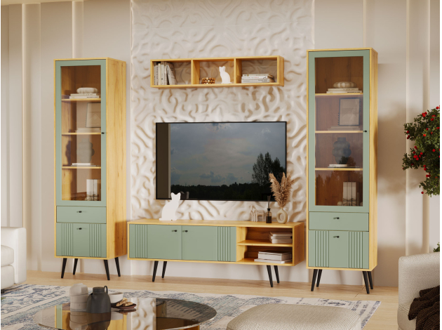 Гостиная Вега Саксония с нишей — элегантное сочетание привлекательного дизайна и функциональности. Изящные фасады с фрезеровкой и вертикальными вставками придают мебели эстетичный вид и отлично дополняют обстановку. Сочетание открытых секций и отделений за глухими дверцами создает визуально легкий и гармоничный интерьер.