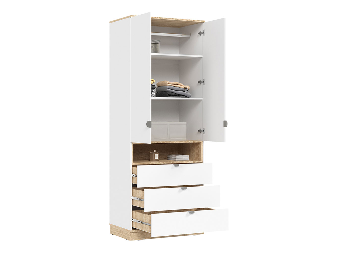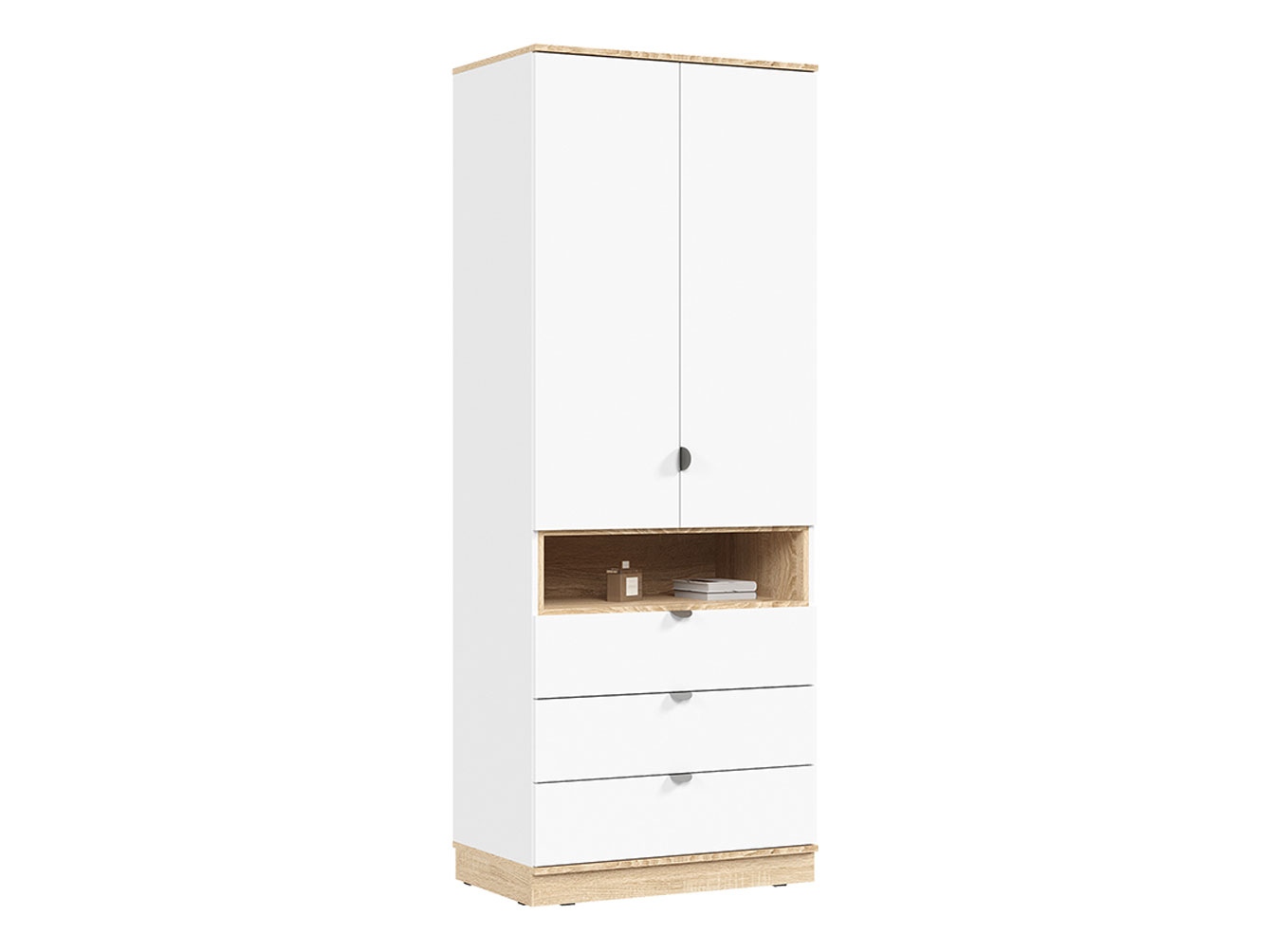 Гостиная Юкка — полноценная система хранения с уютным и продуманным дизайном. Сочетание однотонных фасадов и текстуры дерева создает спокойный, но нескучный интерьер. Стильные полукруглые ручки выступают в роли небольших акцентов. Комбинация из открытых ниш, отделений с дверцами и выдвижных ящиков позволяет без труда поддерживать порядок в комнате.