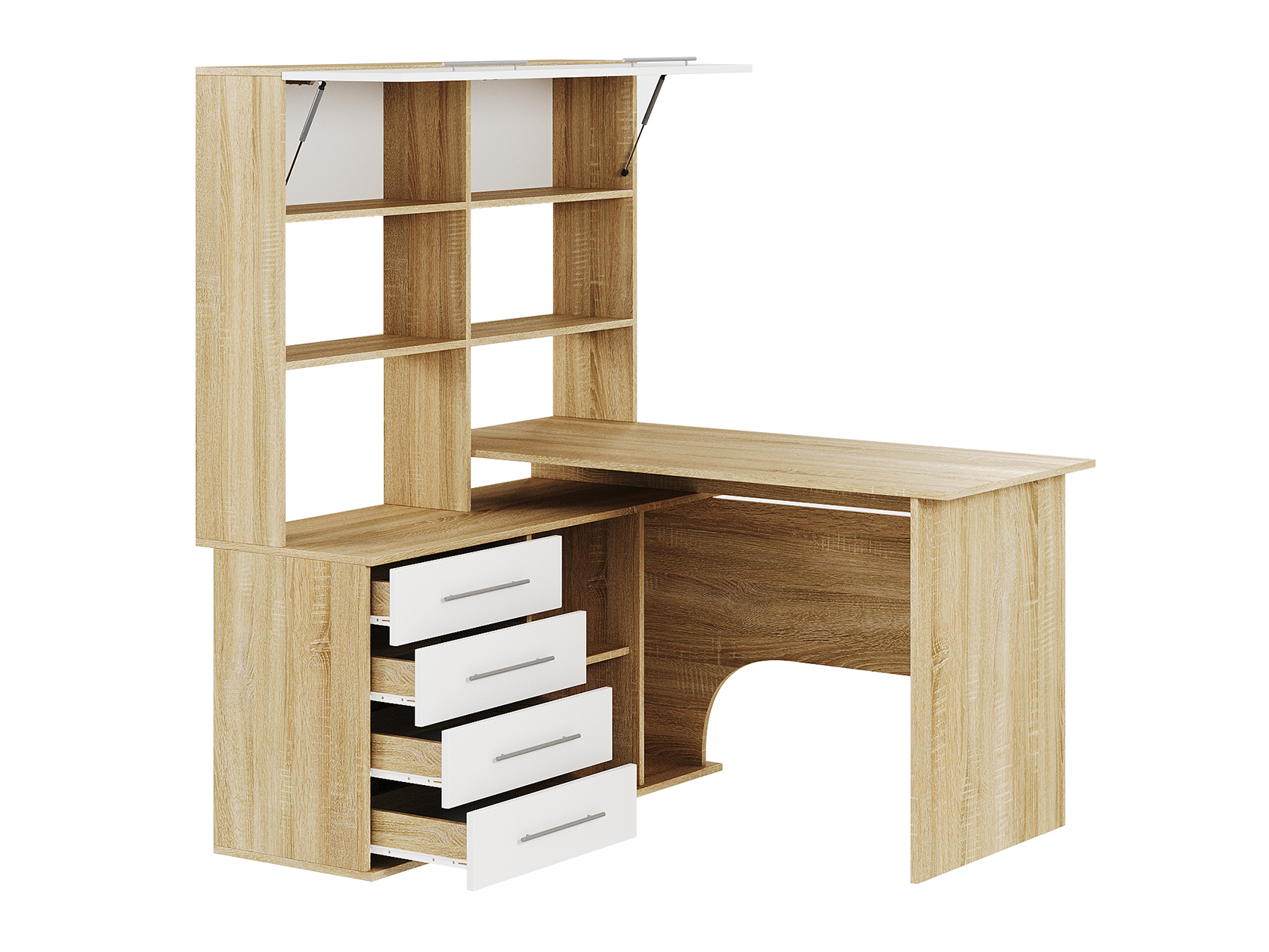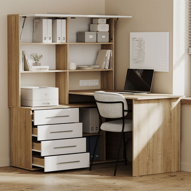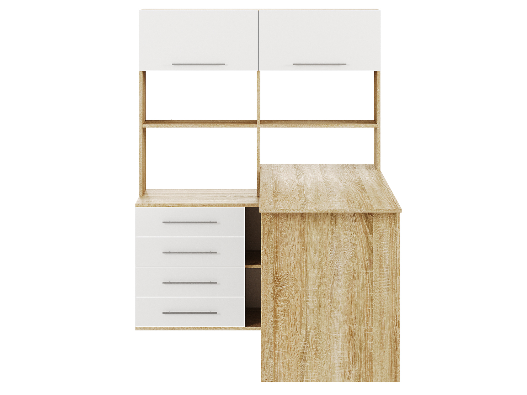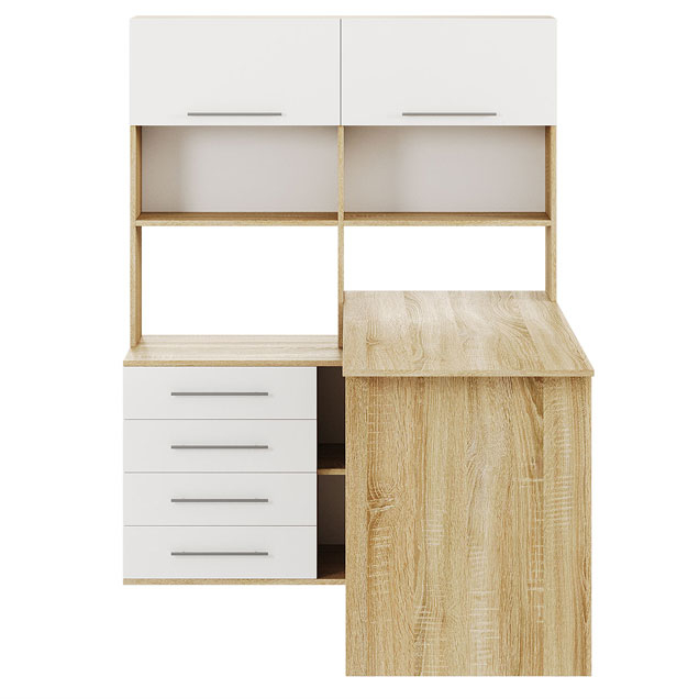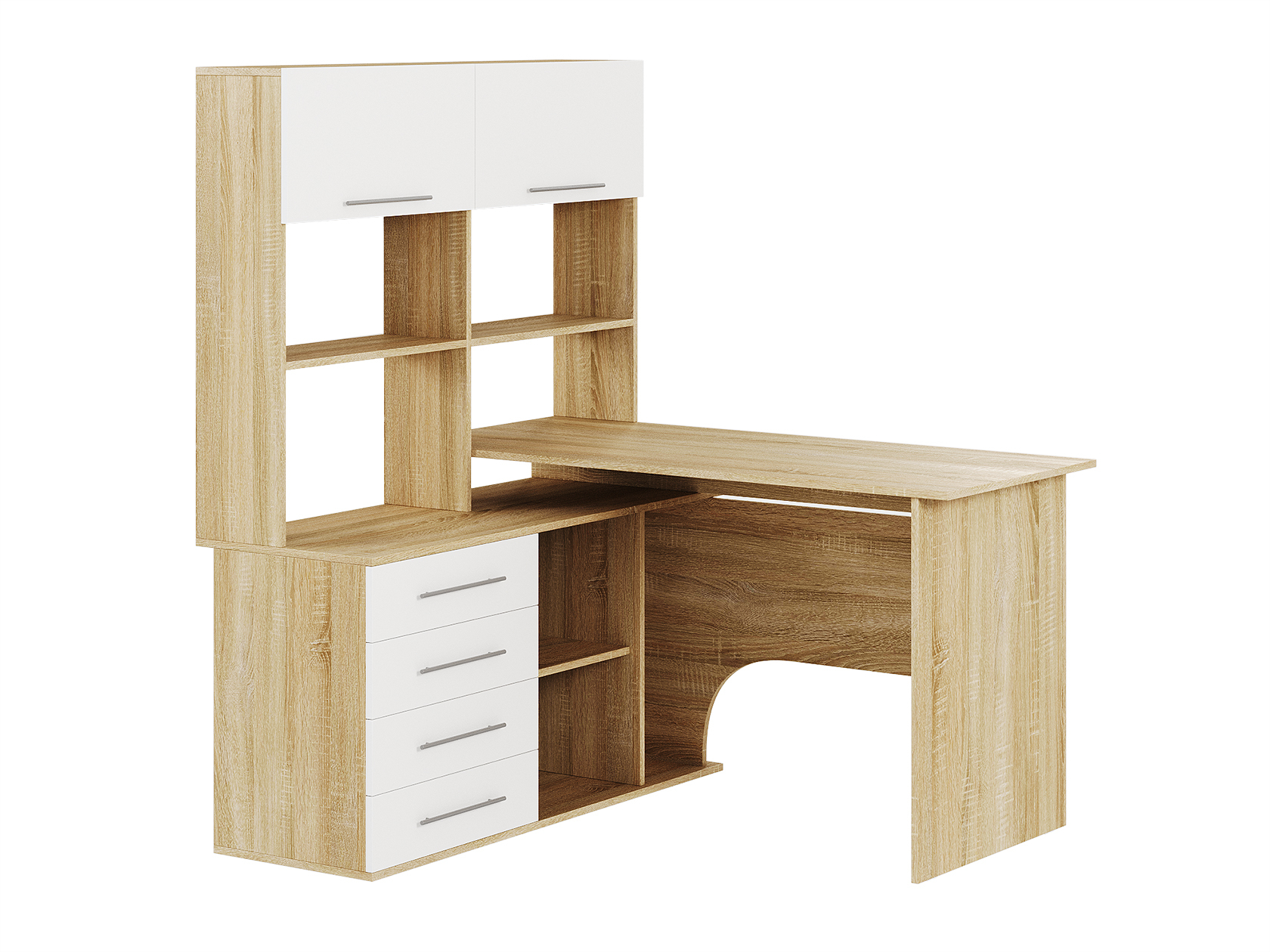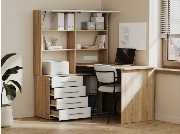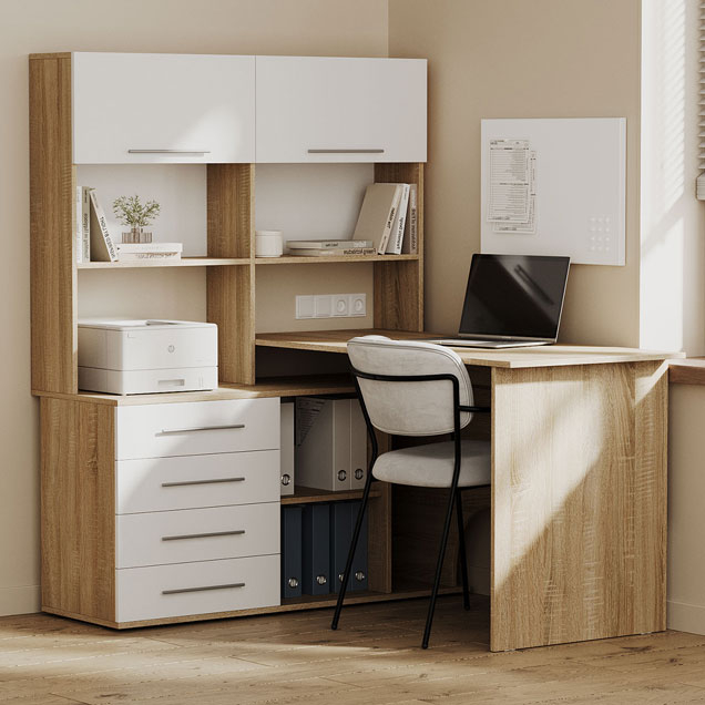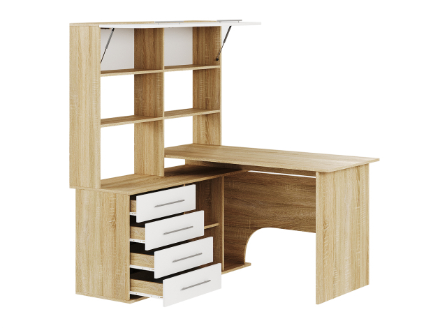 Компьютерный стол Астон — удобная и функциональная модель для домашнего кабинета или офиса. На просторной поверхности поместятся стационарный компьютер или ноутбук, а также оргтехника. В выдвижных ящиках удобно хранить канцелярию и прочие полезные мелочи. На открытых нишах можно расположить файлы с документацией, а за распашными дверцами — спрятать личные вещи.