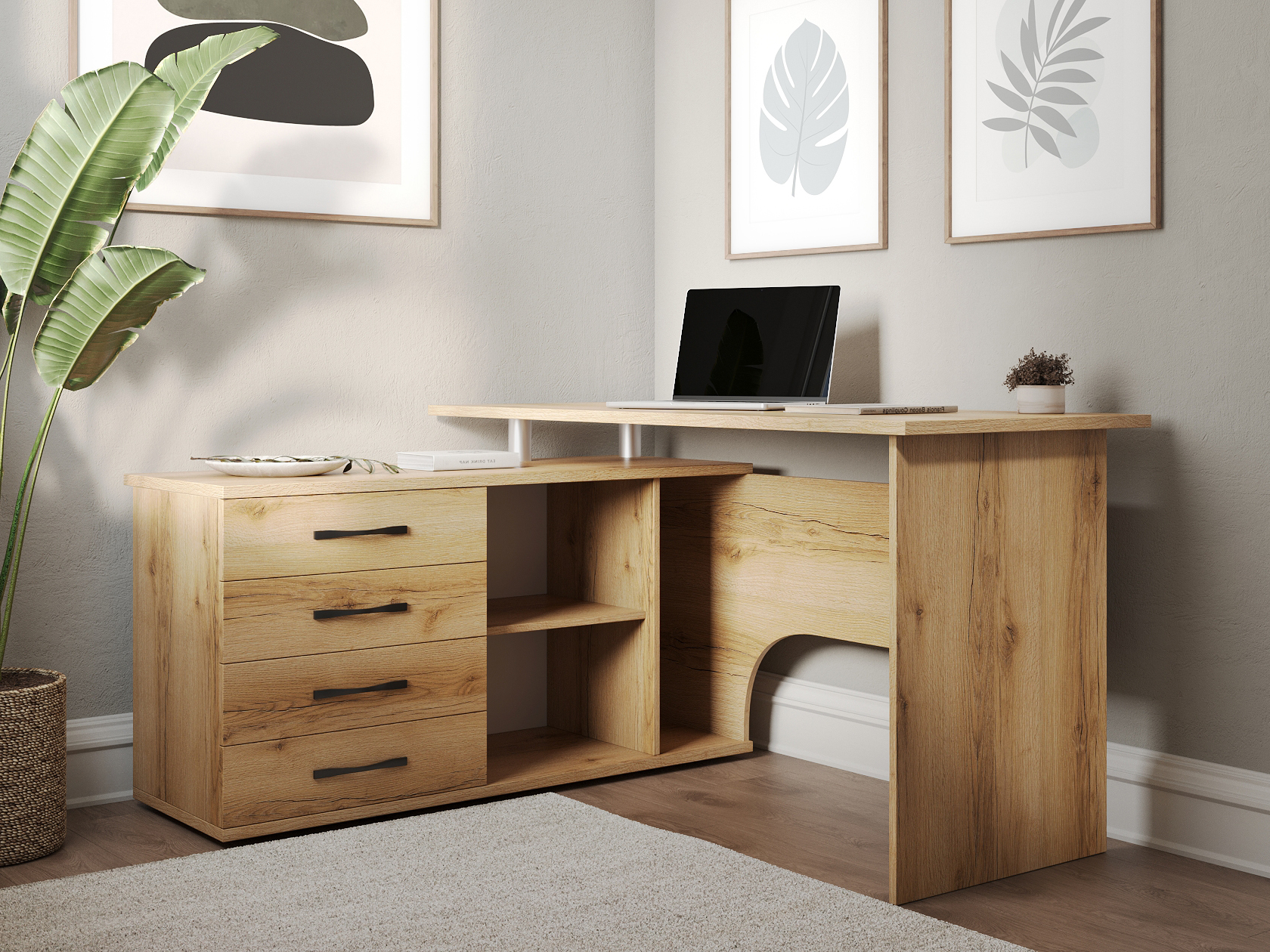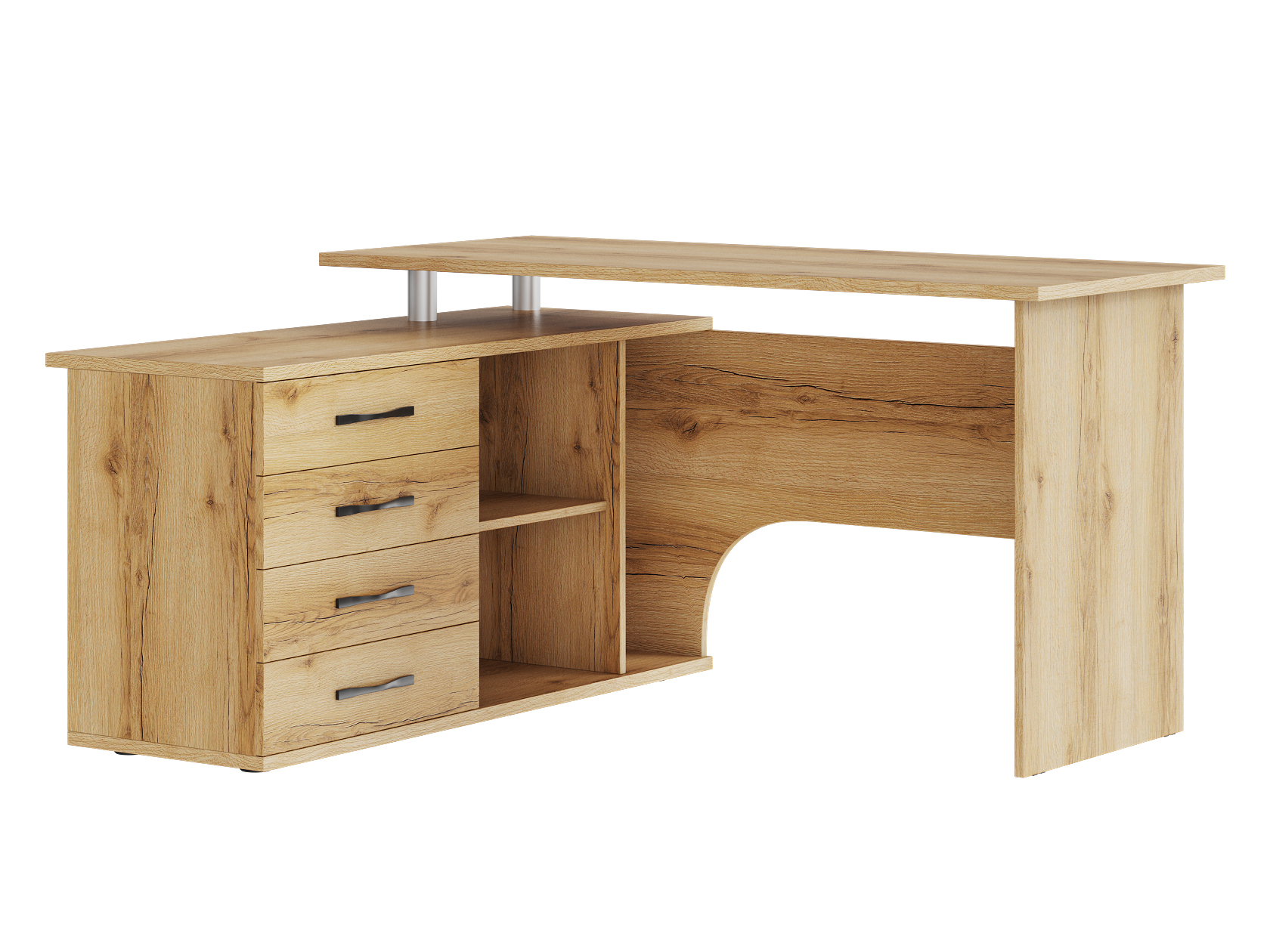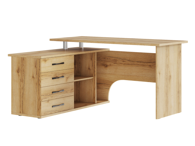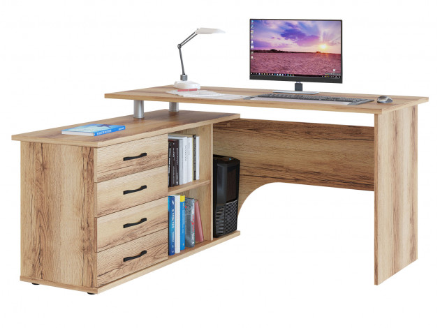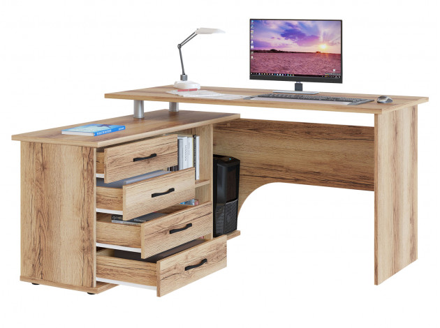 • Угловой компьютерный стол Порту с двумя рабочими поверхностями для организации рабочей зоны дома и в офисе. Основная столешница имеет ширину позволяющую разместить компьютер и рабочие материалы. На малой столешнице удобно держать под рукой книги, папки, канцелярию. Стол оборудован тумбой с четырьмя ящиками на роликовых направляющих, открытыми полками и нишей под системный блок. Такая модель компьютерного стола позволяет организовать функциональную рабочую зону как в домашнем кабинете, так и в офисе.