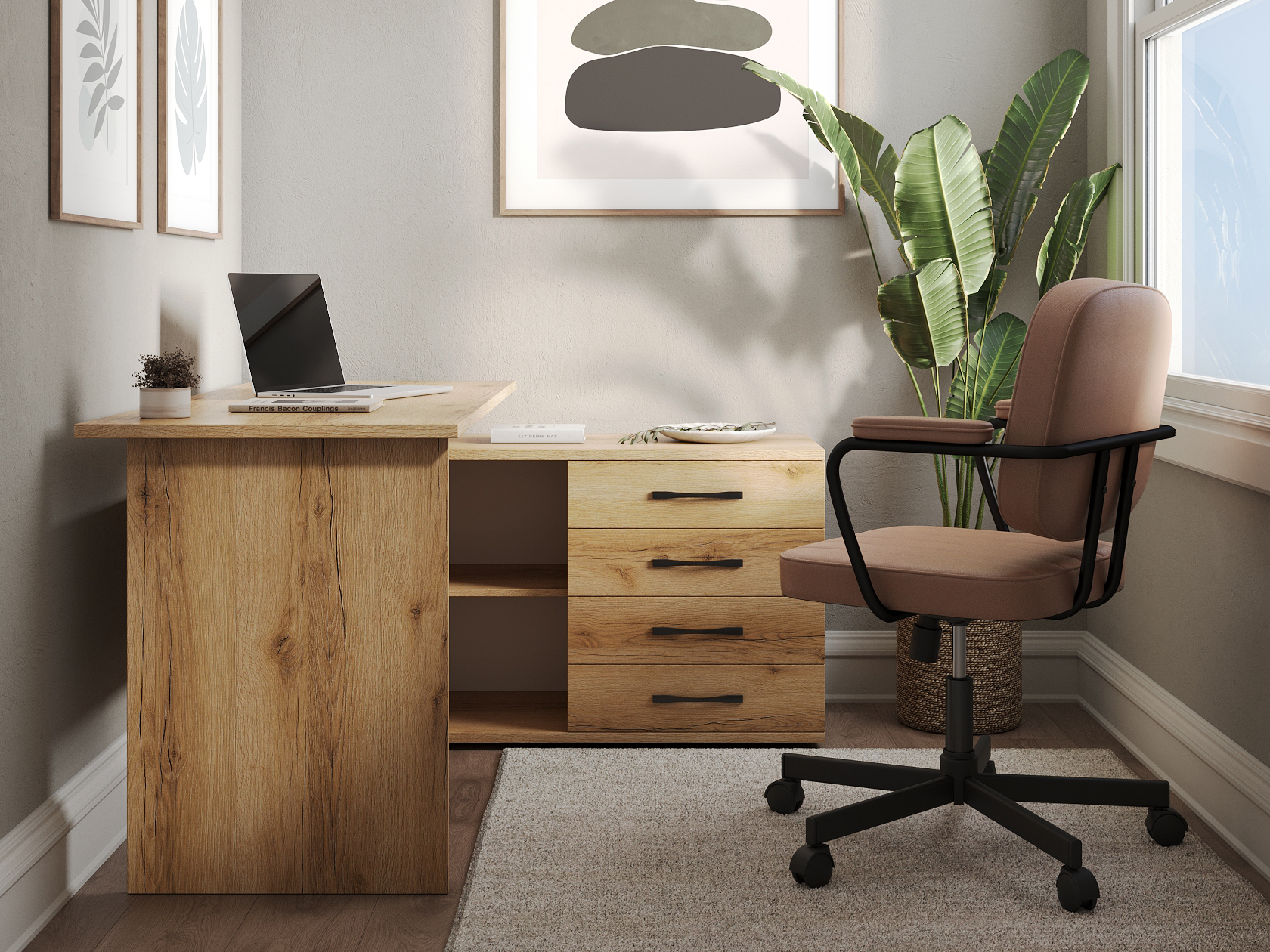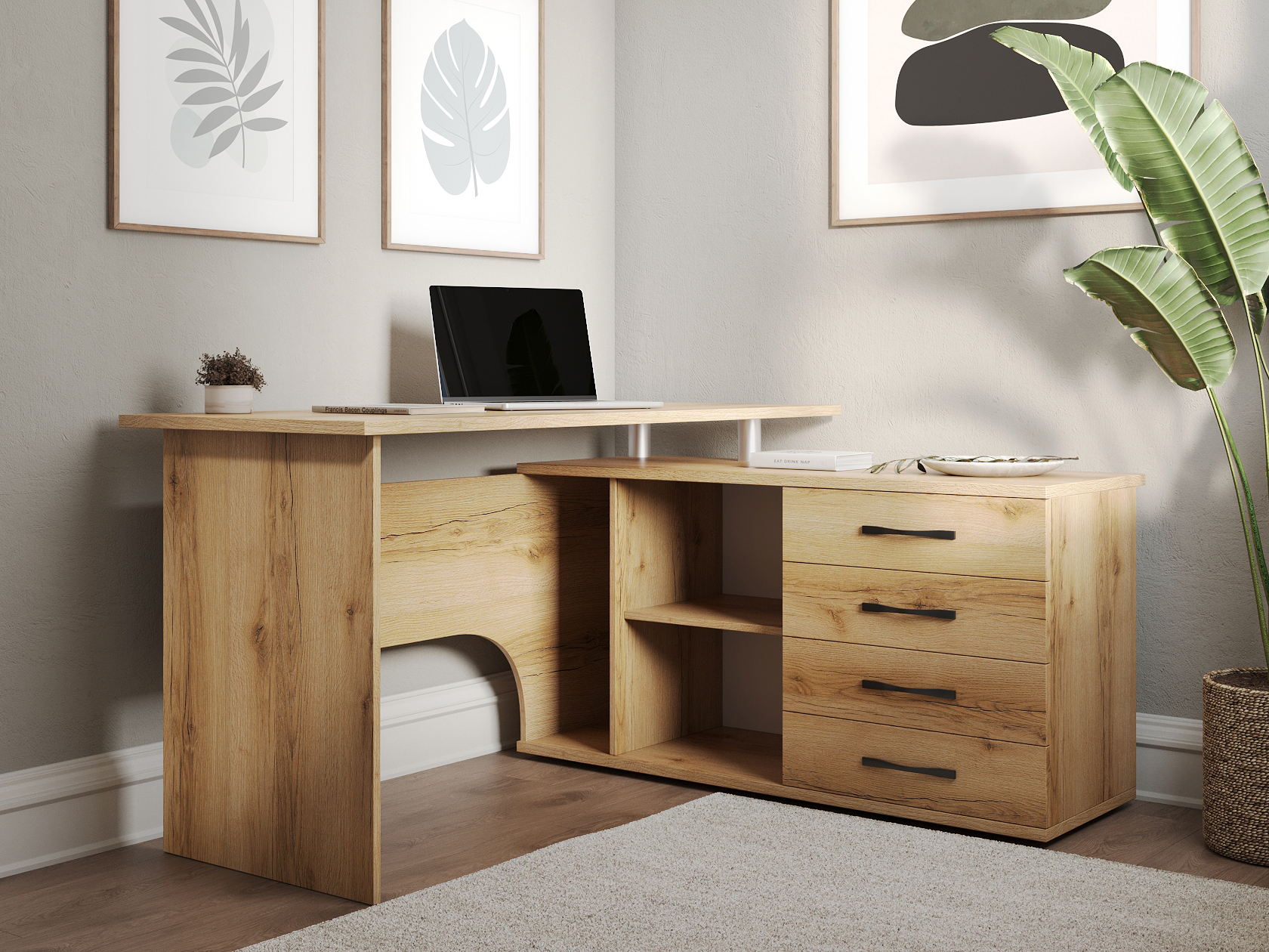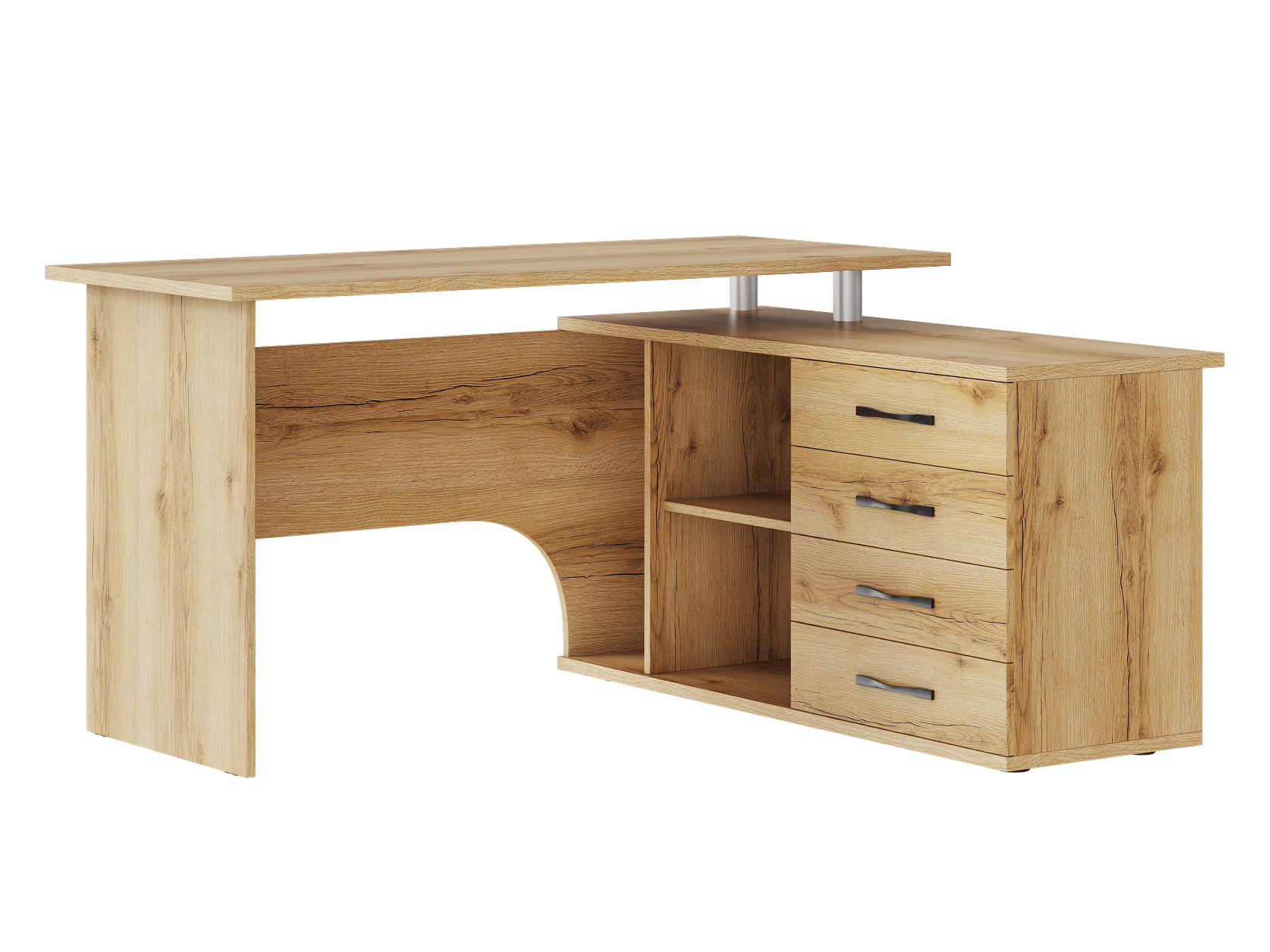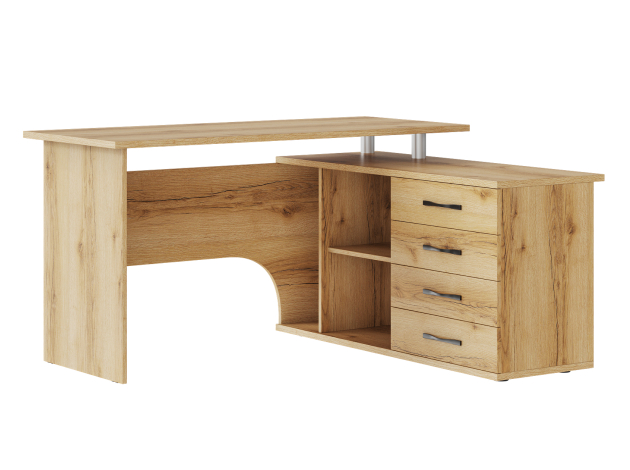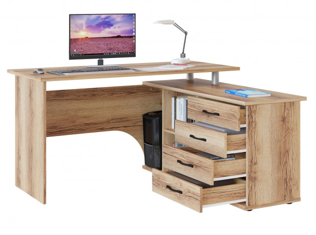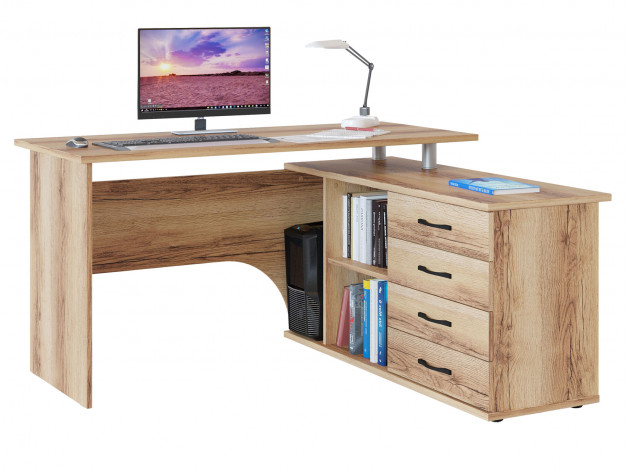 • Угловой компьютерный стол Порту с двумя рабочими поверхностями для организации рабочей зоны дома и в офисе. Основная столешница имеет ширину позволяющую разместить компьютер и рабочие материалы. На малой столешнице удобно держать под рукой книги, папки, канцелярию. Стол оборудован тумбой с четырьмя ящиками на роликовых направляющих, открытыми полками и нишей под системный блок. Такая модель компьютерного стола позволяет организовать функциональную рабочую зону как в домашнем кабинете, так и в офисе.