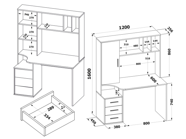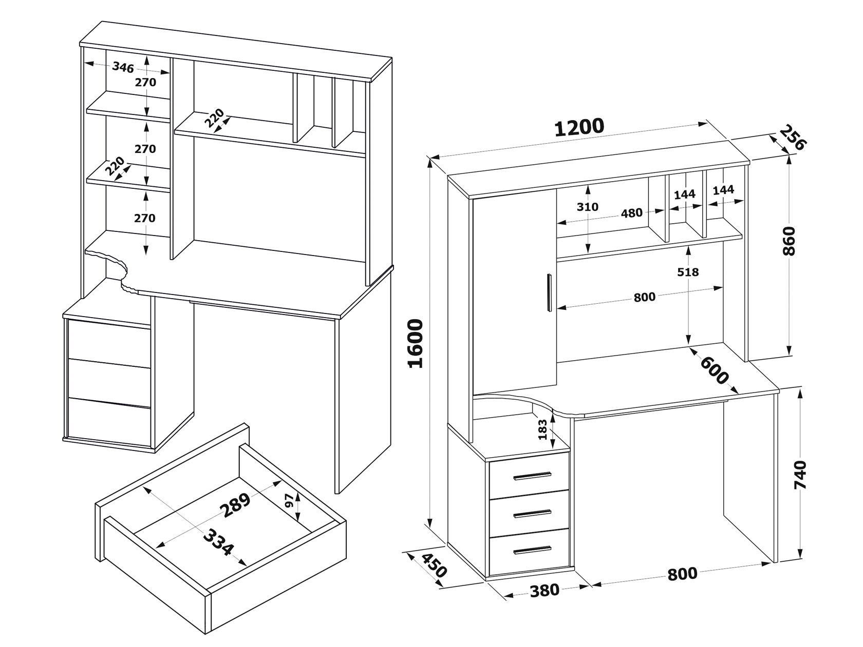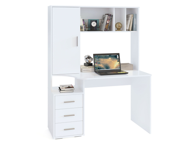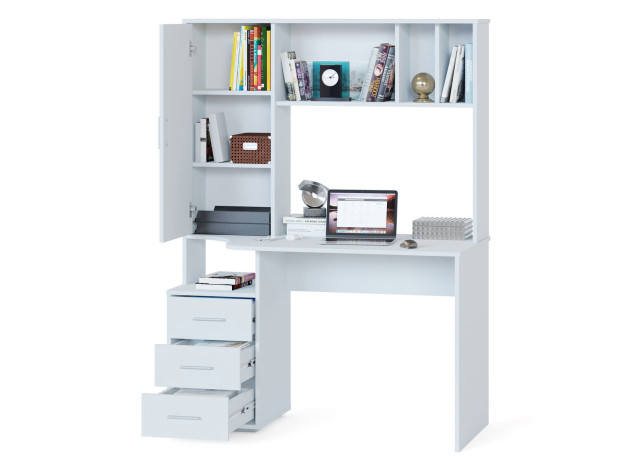 - функциональный — оснащен тумбой с тремя ящиками и надстройкой с полками и стеллажом;
