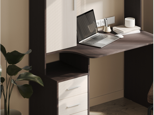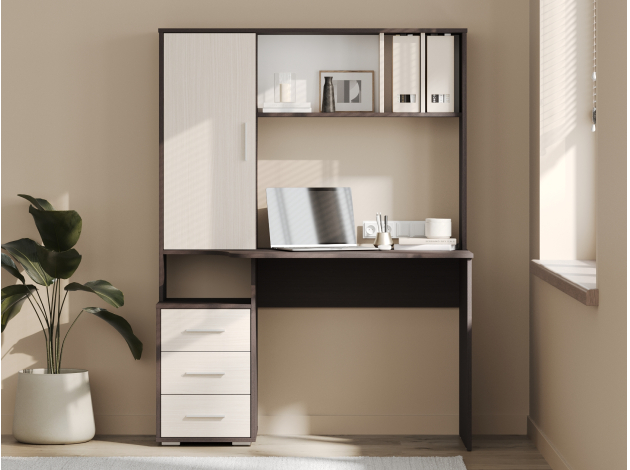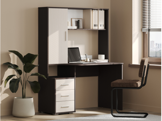 - функциональный — оснащен тумбой с тремя ящиками и надстройкой с полками и стеллажом;
