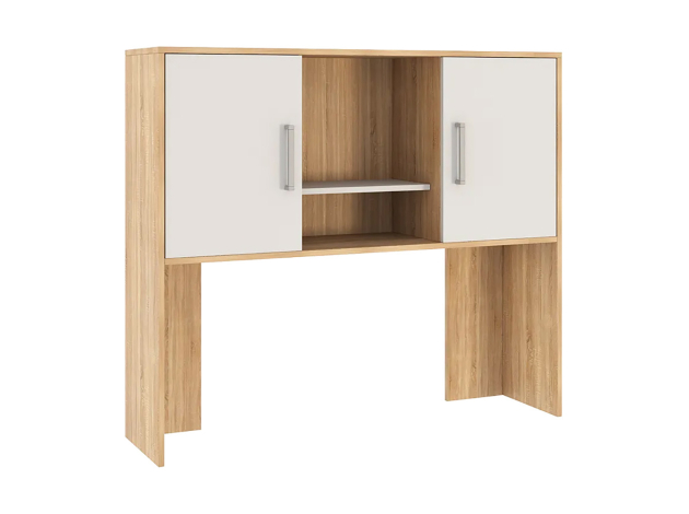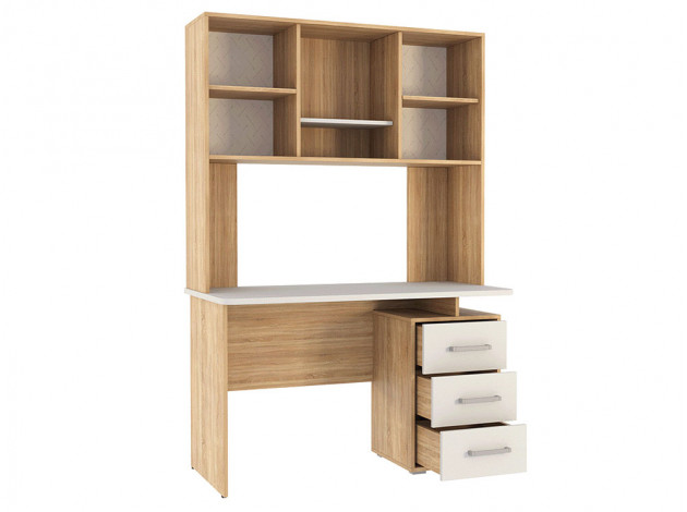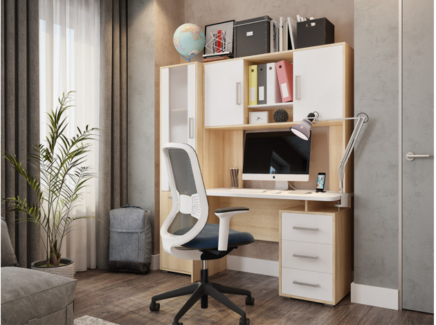 Компьютерный стол Лайт-2 с надстройкой поможет организовать комфортное рабочее пространство дома или в офисе. Просторная столешница подходит для работы и учебы, а надстройка с распашными шкафчиками и открытой нишей обеспечит удобное хранение книг, документов и аксессуаров. Напольная тумба с тремя выдвижными ящиками позволит держать под рукой всё необходимое. Лаконичный дизайн с сочетанием светлых фасадов и фактуры дерева гармонично смотрится в современном интерьере.