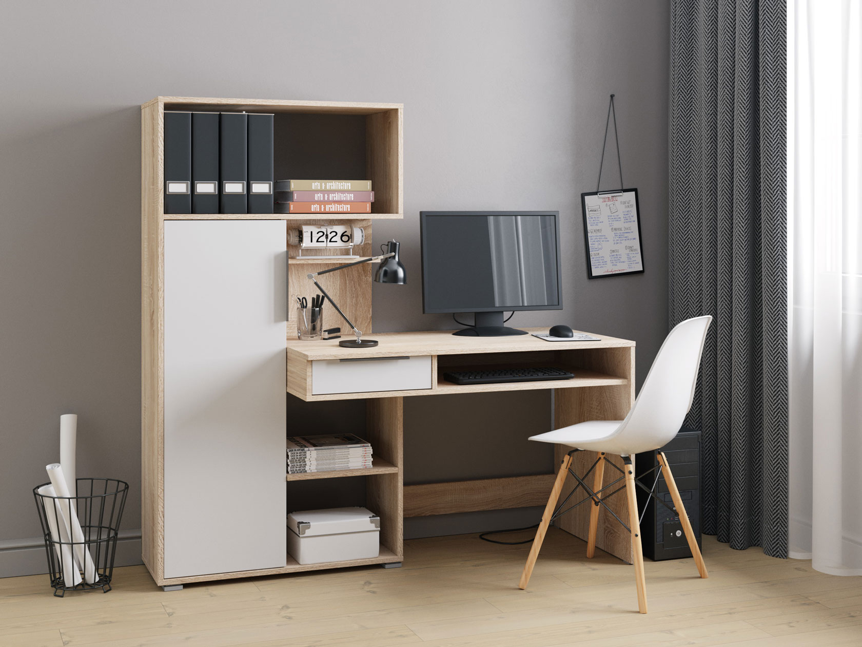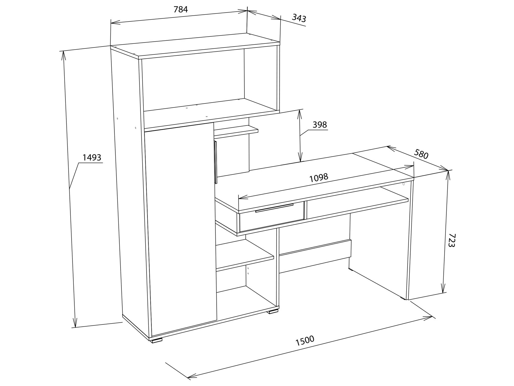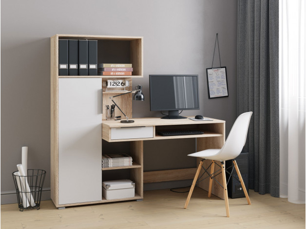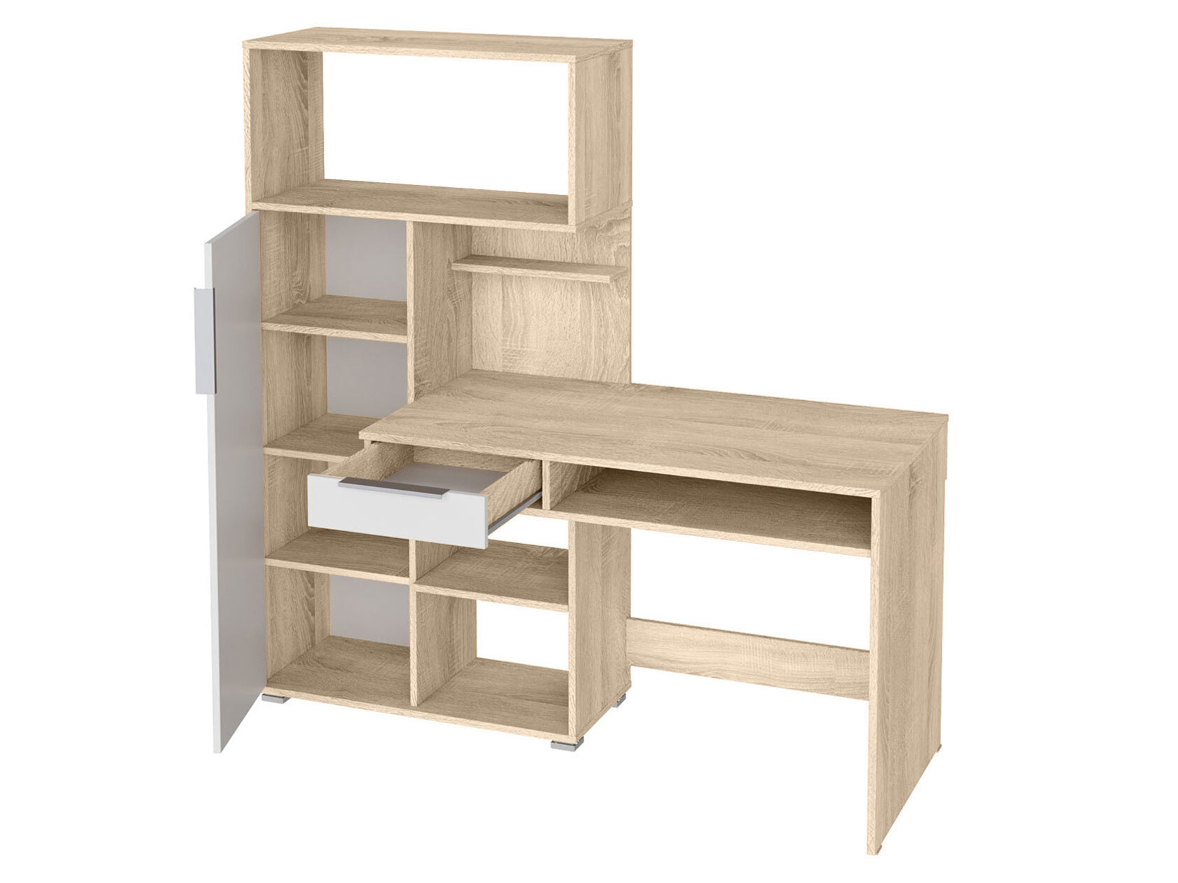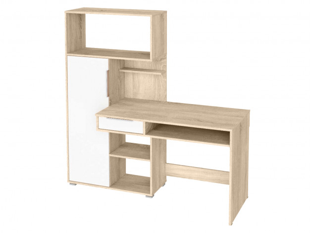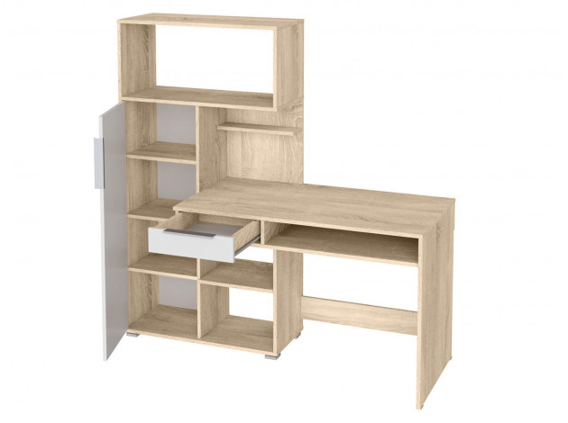 Удобная конструкция с выдвижным ящиком и многочисленными полками позволит оптимально разместить все необходимые предметы. Закрытая секция с глухой дверцей придает модели аккуратный вид.