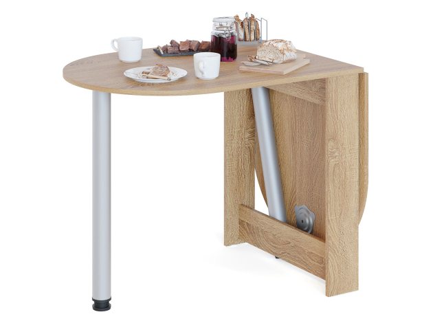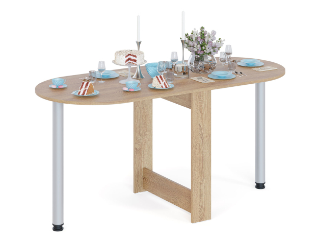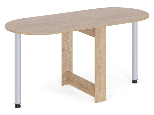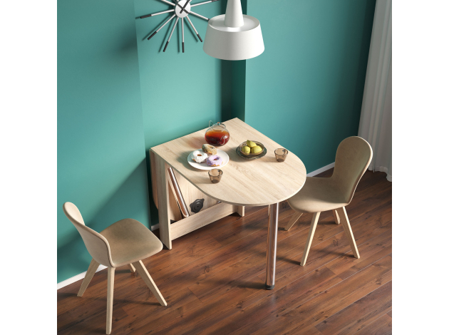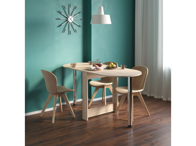 Раскладной стол Олимпио в собранном виде очень компактен и позволит сэкономить пространство, а в разложенном — с удобством разместить до шести человек. Дополнительная опора хранится в специальной нише в основании стола. Скругленные углы столешницы обезопасят от непредвиденных травм. Благодаря регулируемым опорам можно разместить модель даже на полу с неровностями.