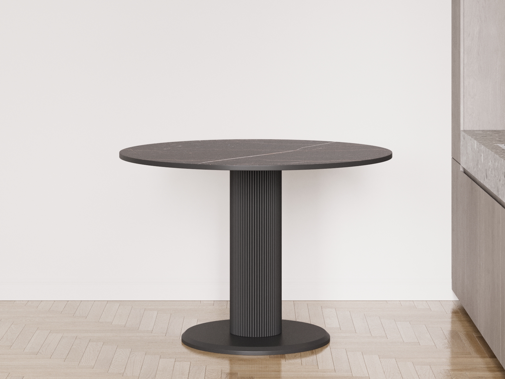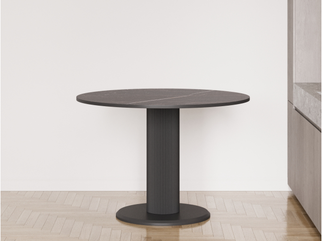 Стол смотрится очень эффектно за счет оригинального силуэта и сочетания разных фактур: гладкой столешницы и рифленой опоры.