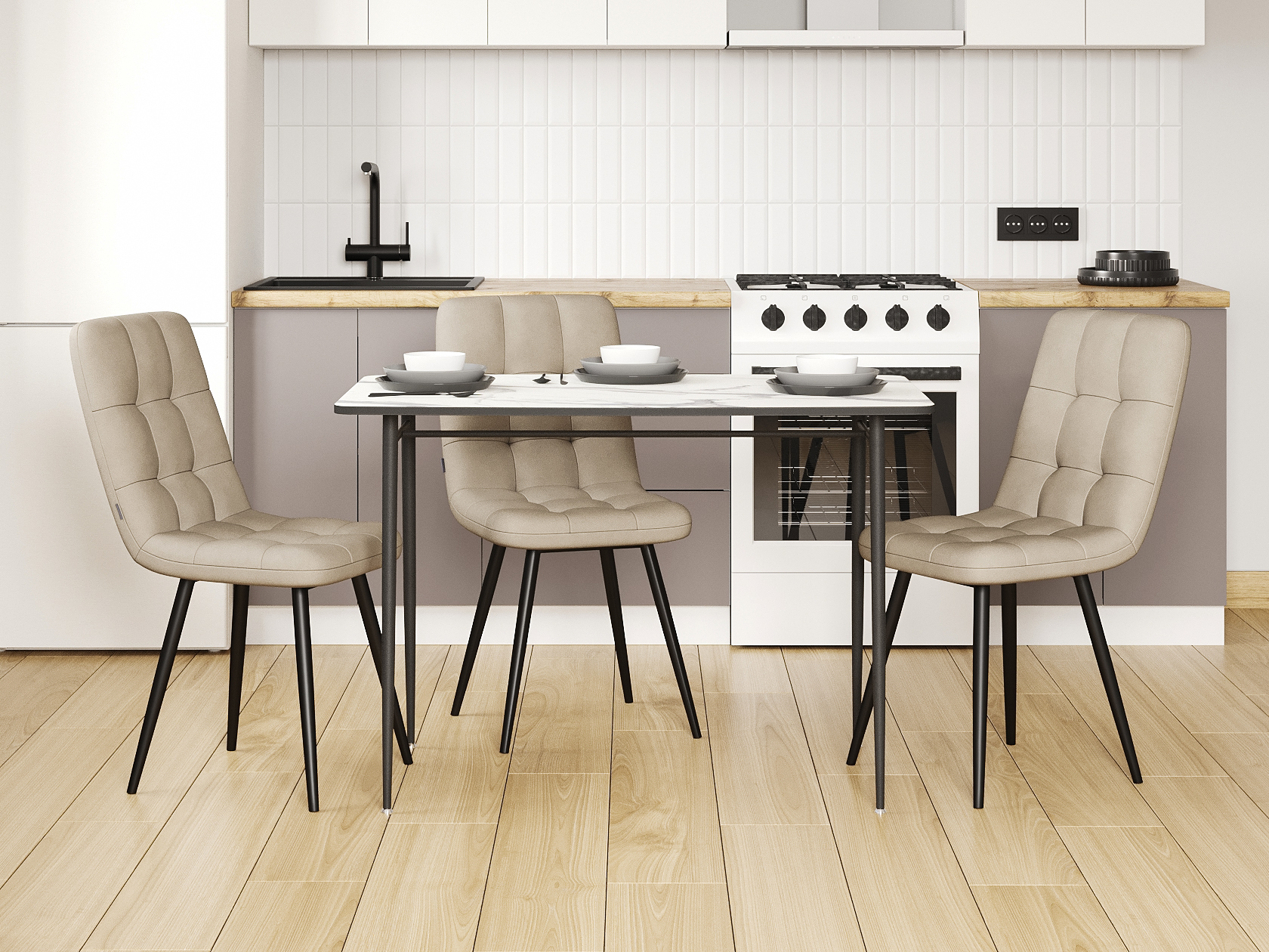 За счет небольших габаритов и прямоугольной формы стол поместится в небольшой кухне или квартире-студии.Края поверхности закруглены, что снижает вероятность травм при неосторожном движении. Вокруг стола комфортно и безопасно передвигаться даже на тесной кухне.
