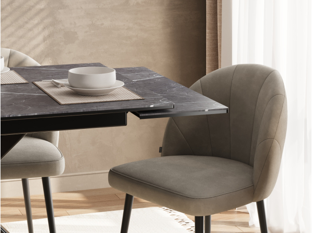 Красивый стол, удобный за счет расположения ножек и выдвижного механизма при увеличении обеденной части стола