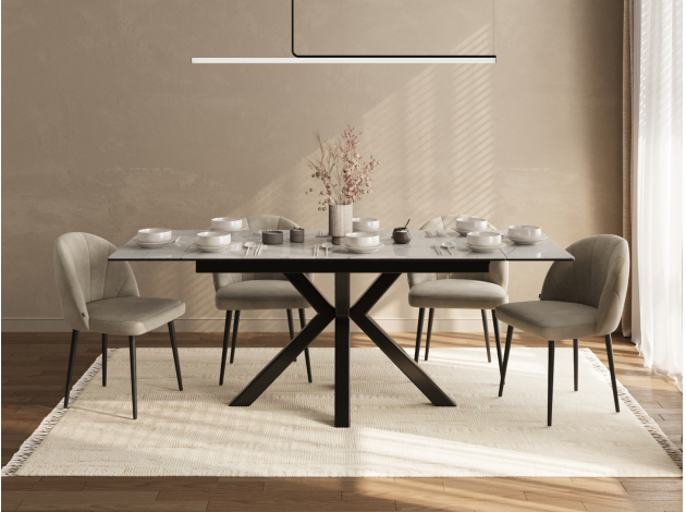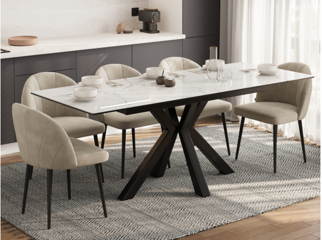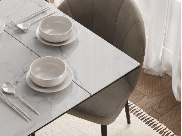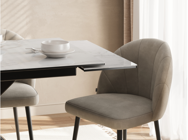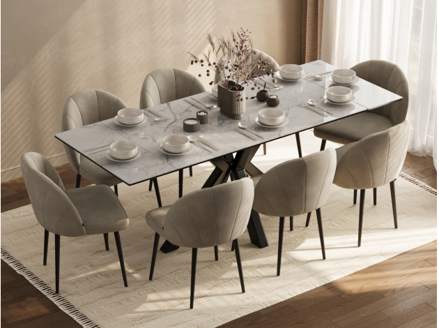 Красивый стол, удобный за счет расположения ножек и выдвижного механизма при увеличении обеденной части стола